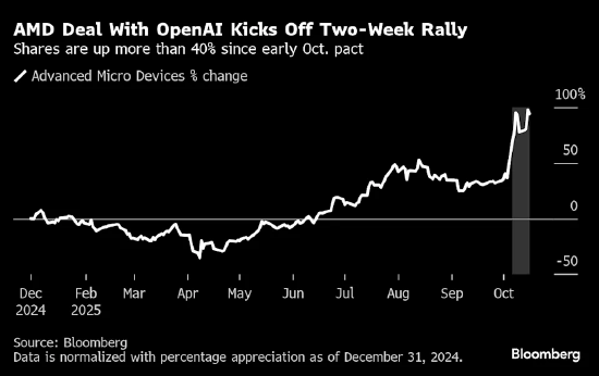 在AMD与OpenAI宣布这项重磅合作后的两周内,这家芯片制造商的股价飙升逾40%。本周,AMD还斩获了甲骨文公司(OracleCorp.)的一笔大额订单,进一步助推其股价上涨。与此同时,博通于周一公布了与OpenAI的独家合作协议,单交易日内股价上涨10%,创下自今年4月以来的最佳表现。