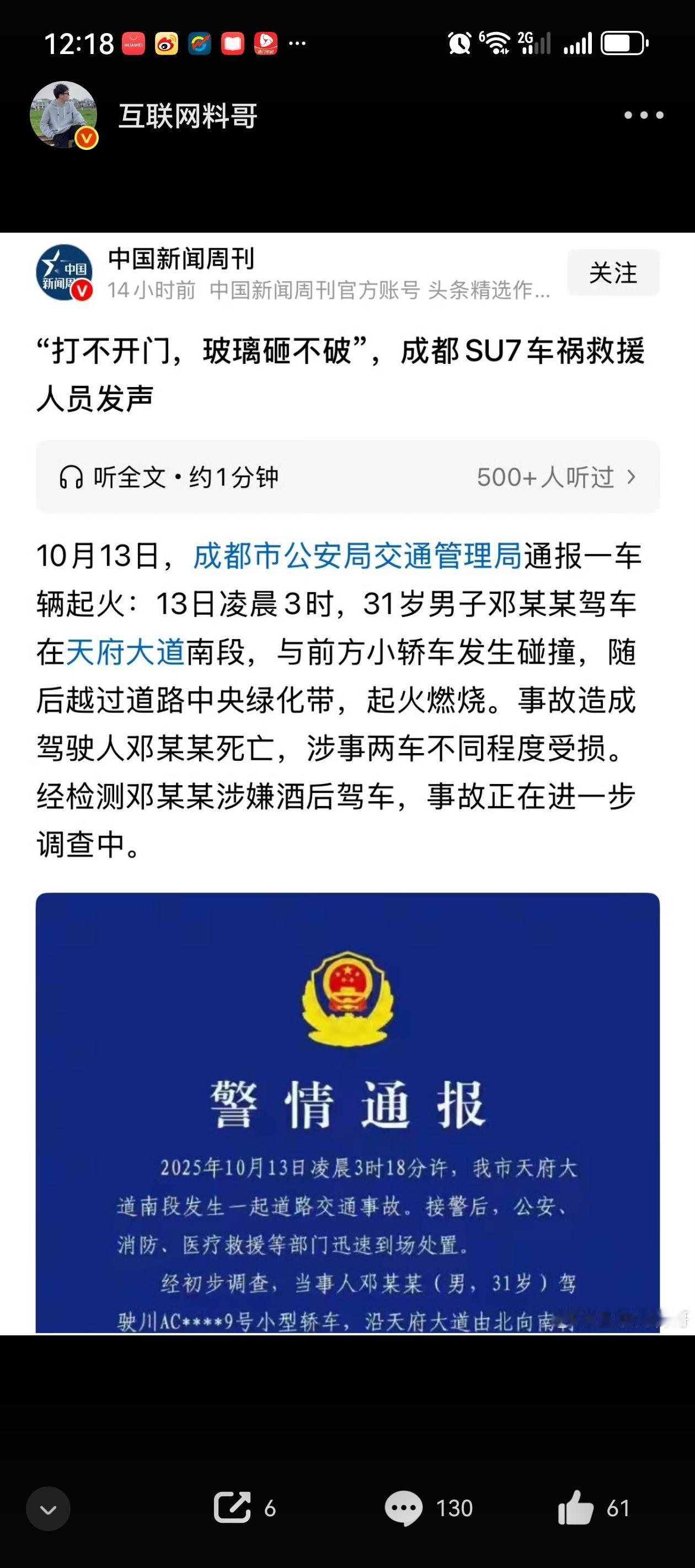 成都小米sU7车祸救援者发声:“打不开门,玻璃也砸不开”。 董明珠也在某企业家微信群说话:小米汽车再出大事,大量车主吐槽质量有问题! 正想买一辆电车的我看得是瑟瑟发抖。 而前不久周鸿袆却说“未来就没有人买油车了,再豪华的油车也会被电车取代。” 究竟听谁的呀,朋友们都开的电车还是油车,请大家给点意见[祈祷] 请评论区赐教。