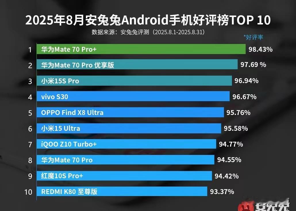 安兔兔这榜单可以[赞] 搭载玄机01的小米15Spro, 9月份好评榜第一, 因为8月份华为mate70pro和pro+, 被踢出榜单了,不参评了! 这不是跑分榜,是好评榜! 至于么?