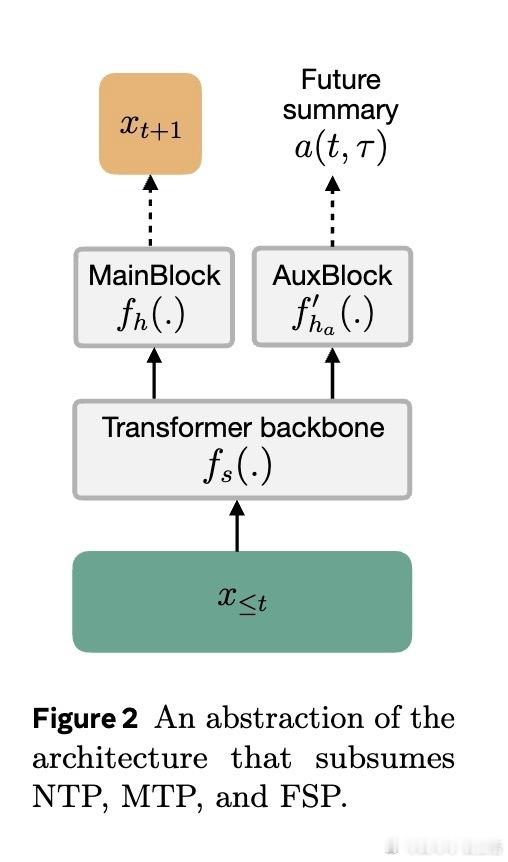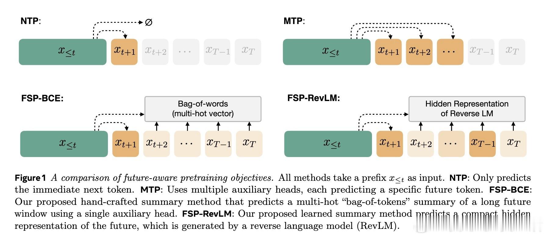 NTP训练时使用“教师强制”带来的训练推理不匹配(exposure bias)限制了模型的长远生成能力。MTP虽部分缓解,但受限于预测长度和辅助头数量。FSP通过预测未来的抽象摘要,提供了对未来更全局、紧凑的监督信号,激励模型学习深层次的长期依赖。