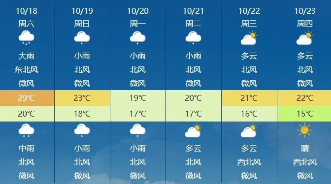 今天多云到阴,有时有阵雨或雷雨,20-29度。今天中午前后冷空气主体将自北而南影响我市,有一次明显降温、大风和降水天气过程。20日起日平均气温将下降到22度以下,我市将进入气象意义上的秋季,入秋时间较常年偏晚16天(常年10月4日)。气温下降后,大家要及时添衣,谨防感冒。