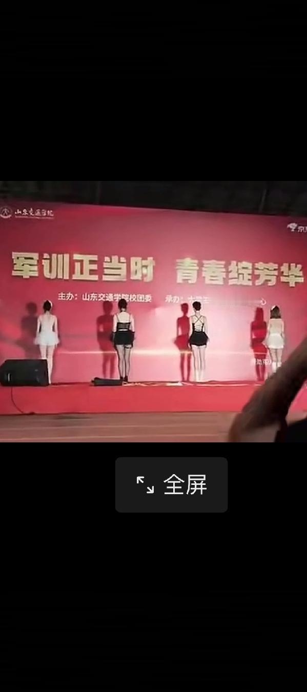 山东交通学院举办的“军训正当时。青春绽芳华”晚会上的表演。 女学生不穿军训服上台穿暴露装,只见她们丝袜短裙台上扭动,不看背景墙上的内容,还认为是某商业表演,根本看不到现在大学生该有的样子, 朋友们怎么看?