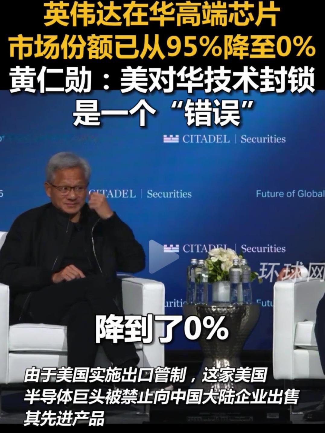 0%!黄仁勋终于感觉到了痛! 英伟达黄仁勋10月6日表示,在中国的市场份额100%清零,从95%清到0%! 常言道,只有失去了,才感觉到珍贵! 不过黄仁勋这次没有再傲慢,而是说了实话,很是不舍。 他对美国的观点:无法想象,任何决策者觉得这是个好主意,美国不参与这个市场是错误。 他对中国的观点:中国拥有世界第二大计算机市场,是一个充满活力的生态系统。 英伟达在中国赚得盆满钵满,却在需要你的产品时,把中国当低端市场,大搞卡脖子、产品阉割、留后门,搞垄断,想摁死中国的科技发展,结果是自食其果。 再想找一个中国这样的市场,英仁勋只能是幻想了,再想进来,比做梦还难。 以为中国会求你的时代结束了,中国的芯片,芯片设备都己突破,英伟达的退出,是把市场还给中国企业,吃饭砸锅的时代也结束了!黄仁勋定律