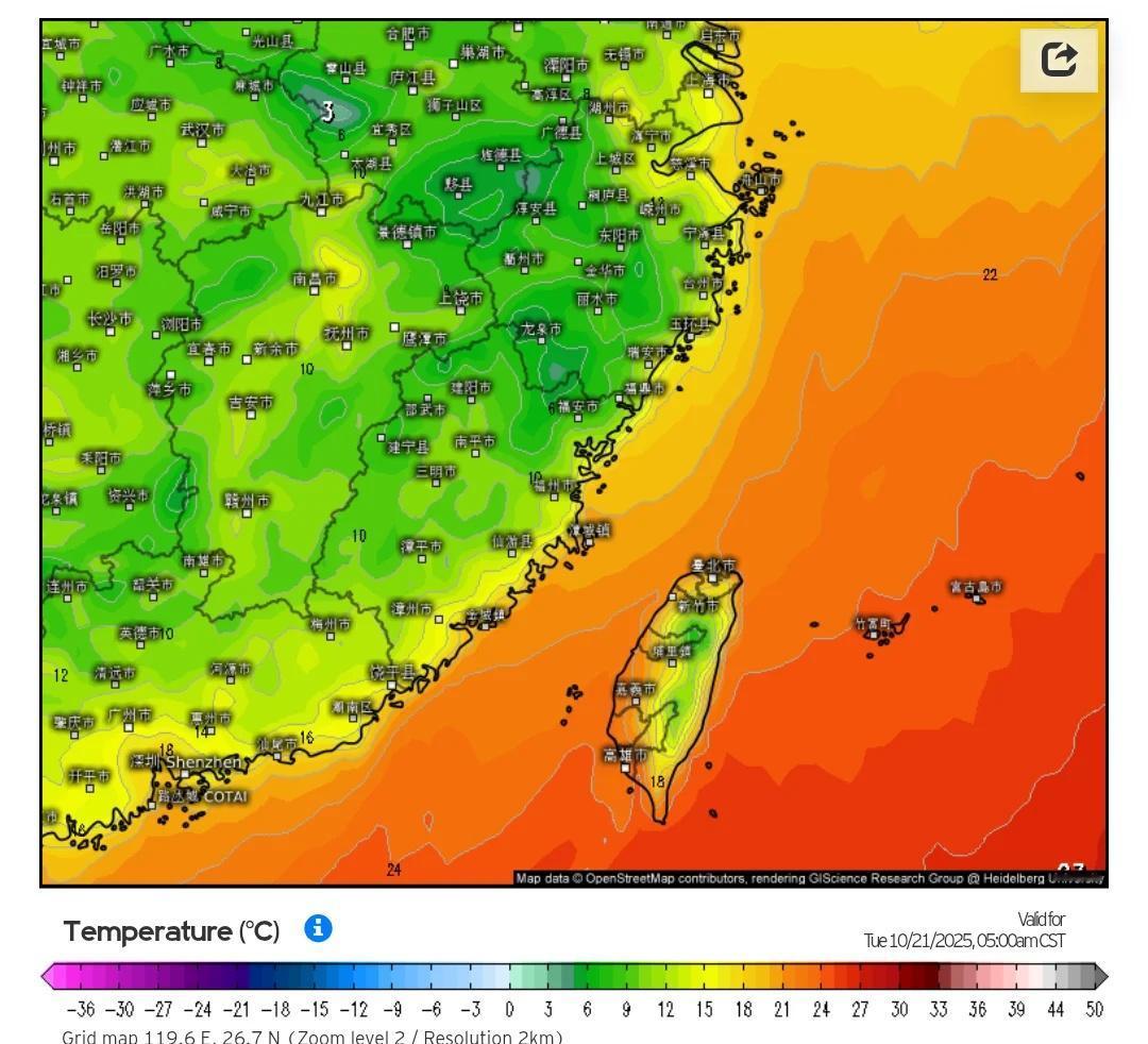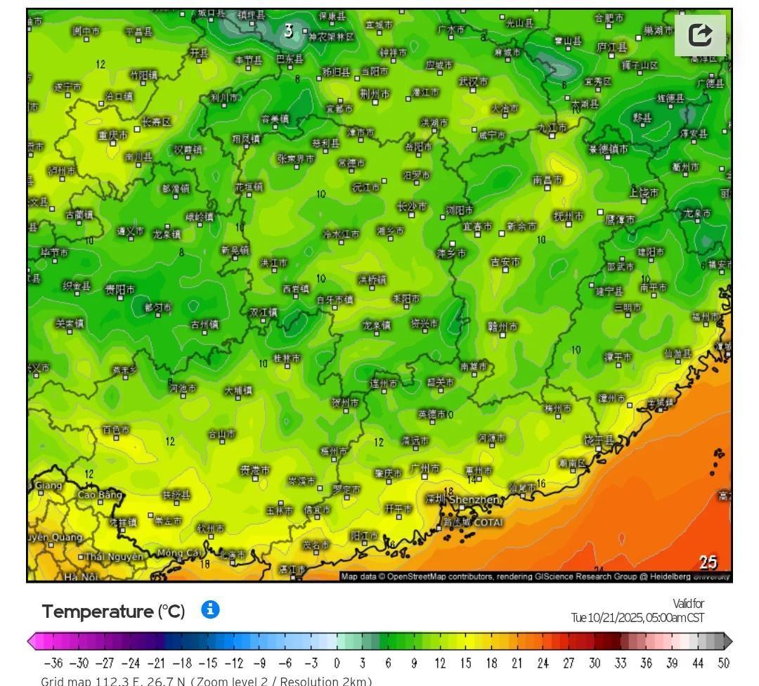 南方高温即将结束 近期多数值模式预报指出10月中旬末至下旬初期将有明显冷空气南下,南下幅度将为下半年以来最深,该趋势稳定多报,信号明显。10月17日前后冷空气就将启程南下渗透,最快在19日前后将越过长江进入江南,21日冷空气前锋就可能进入南海,驱散大陆苦暑,除华南沿海以外的南方大部很有希望出现秋日,本轮冷空气过后,南岭武夷山以北的大部分地区有望入秋。冷空气