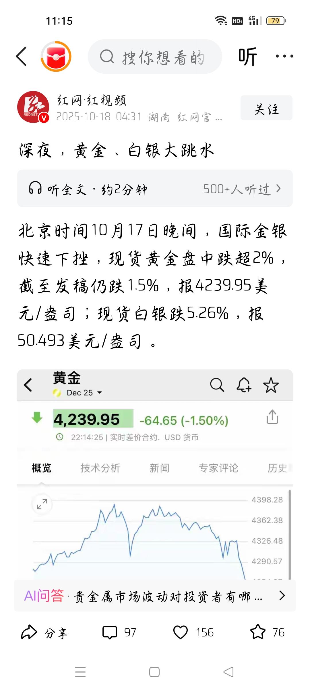 黄金白银大跳水,我想说 据华尔街见闻报道,10月17晚间,国际金银快速下挫,现货黄金盘中跌超2%,截至发稿仍跌1.5%,报4239.95美元/盎司,现货白银跌5.26%,报50.493美元/盎司,我想说,近期,黄金连续跨过4000美元、4100美元、4200美元、4300美元,有人说黄金涨疯了,各家银行纷纷提示交易风险,现在黄金白银大跳水,是逆转呢?还是回调呢?个人认为是回调,前一段时间,涨疯了,有人获利了结。还有美股在涨,地缘政治局面在缓和。所以说黄金白银不可能一直涨下去,会回调,至于是否是投资机会,仁者见仁,智者见智。我等平民老百姓,还是望洋兴叹。各位条友觉得呢?
