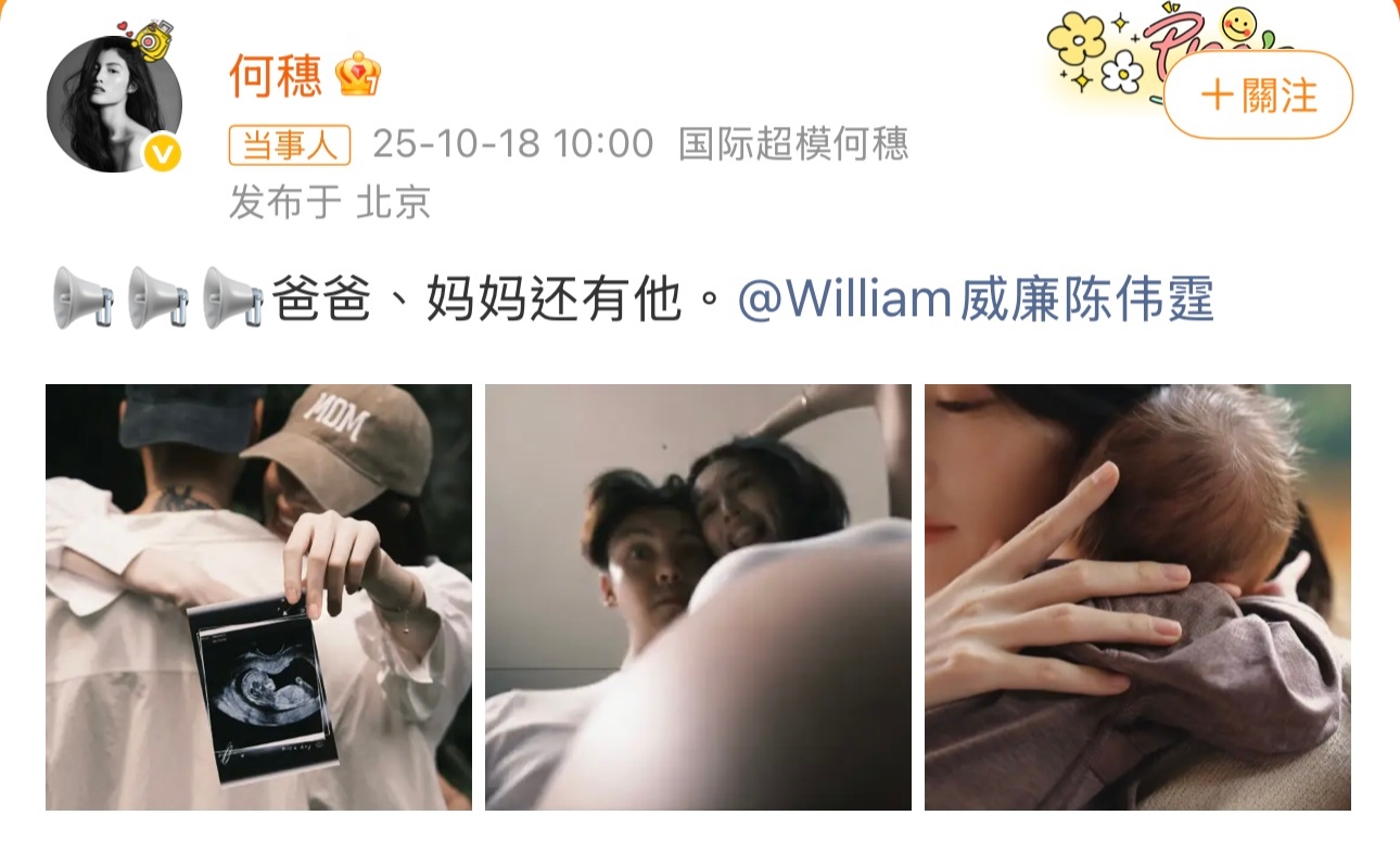 陈伟霆何穗官宣生子,好幸福甜蜜的一家人,要一直一直幸福下去呀,祝福!