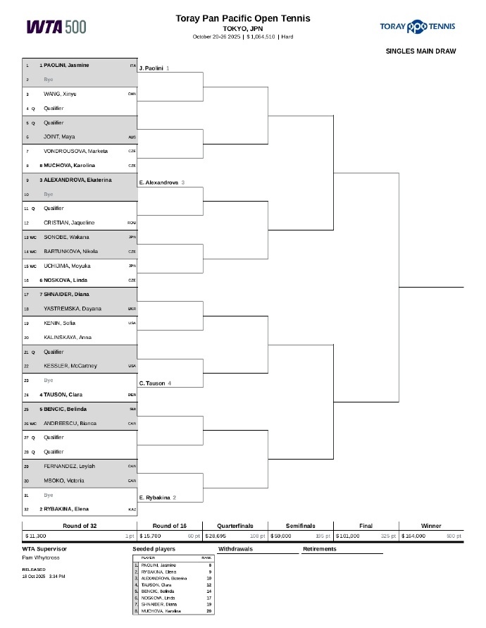 本站1号种子是保利尼、2号种子是莱巴金娜、3号种子是亚历山德洛娃、4号种子是陶森。