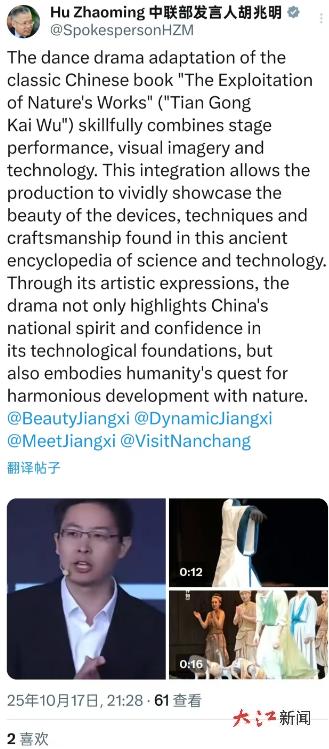 大江新闻讯全媒体记者钟剑桥报道:10月17日,中共中央对外联络部新闻发言人胡兆明通过个人社交账号及非洲新媒体平台StartimesOn《看中国》专区,发布了舞剧《天工开物》谢幕表演的演出视频,让网友直呼“惊艳”。