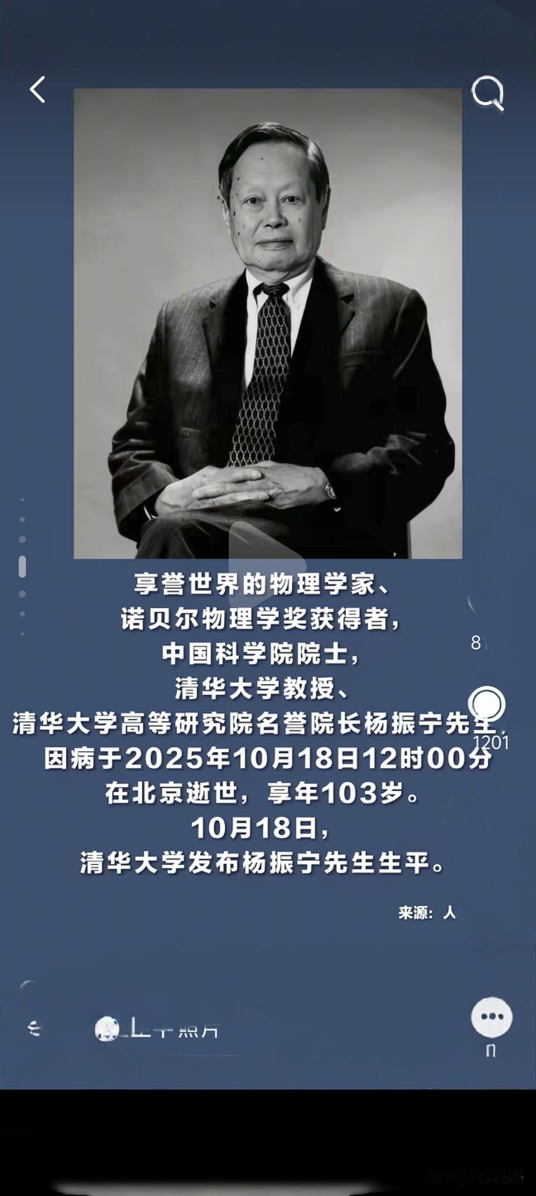 天塌了,一觉醒来,就发现很多的官方媒体都在转发,我们的科学巨擘杨振宁老先生在北京逝世,享年103岁。 一颗科学巨星的陨落!中国物理学奠基人杨振宁老先生在北京逝世,享年103岁。 一觉醒来,就看到很多的官方媒体都在发杨振宁老先生在北京逝世。 中国科学院院士杨振宁老先生,因为自己的年龄已经过百,再加上自身的疾病,已经医治无效,2025年10月18号与世长辞,享年103岁。消息一传出来,举国同悲,科学界痛失了一名泰斗。 杨振宁,在1957年,与李政道一起提出了“宇称不守恒”的理论,成为了中国首位获得诺贝尔奖的华人科学家。 而他提出的“杨-米尔斯规范场论”是20世纪以来物理学的三大支柱之一,也为粒子物理标准模型奠定基础。 在我们国家还很落后的时候,他不顾一切的放弃了美国的国籍,坚定地回到国家,为国家的科教事业和物理学发展、人才培养和国际交流做出不可磨灭的贡献。 现在巨星陨落,山河同悲,让我们致敬二十世纪最伟大的科学家之一!杨振宁。 他的科学之光,将会永远的照亮后世的求索之路。 杨振宁老先生的一生,都在追求真理、献身于科学、报效祖国的一生。 现在他的离去,是全人类的巨大损失。让我们共同缅怀这位伟大的科学巨匠,铭记他的不朽功勋,愿先生一路走好,精神永存!