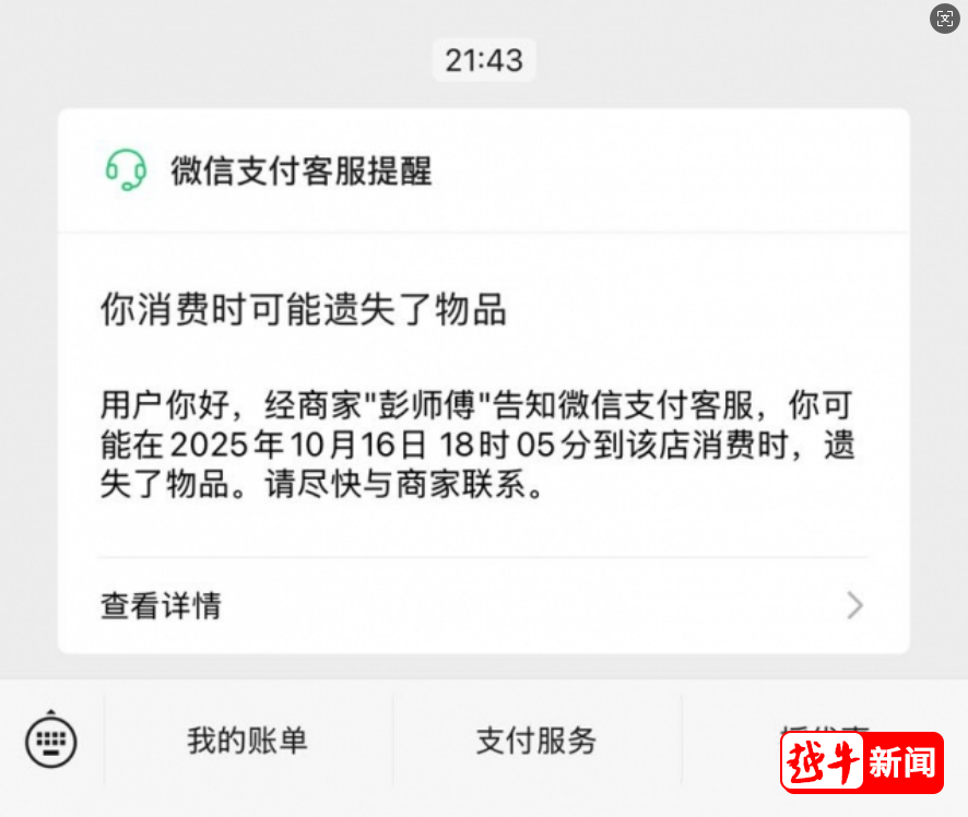 就在丁先生几乎放弃希望时,微信支付上一个“小红点”让他眼前一亮——系统提示“你消费时可能遗失了物品,请尽快与商家联系”。点开一看,竟是出租车司机彭师傅通过微信支付留言功能,发来了失物招领信息。