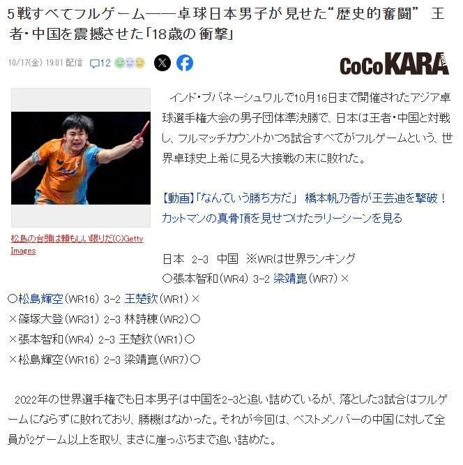虎扑10月18日讯在此前结束的乒乓球亚锦赛男团比赛中,国乒3比2战胜日本,其中5场都打到了决胜盘。雅虎日本站乒乓球专栏作者伊藤条太撰文,称“这场世界乒坛罕见的大战,足以载入史册。”