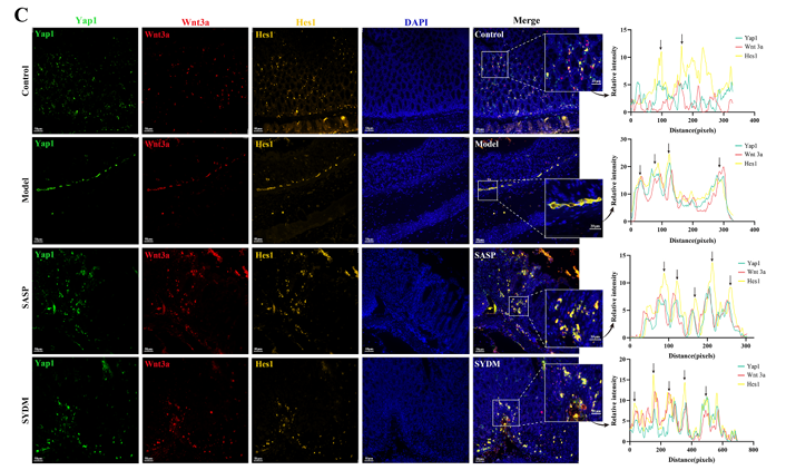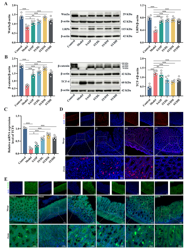 机制层面,研究证实芍药汤通过激活“经典Wnt/β-catenin通路”与“替代Wnt-YAP1/TAZ信号轴”双通路,协同调控肠干细胞功能:在经典Wnt通路中,芍药汤上调Wnt3a、LRP6、β-catenin及转录因子TCF4的表达,免疫荧光显示Wnt3a的表达量与上皮完整性呈正相关,β-catenin在细胞膜和胞内的积累也显著增加,可促进肠干细胞增殖相关靶基因的表达;在替代Wnt通路中,芍药汤提高FZD1、Gα13、YAP1、TAZ的蛋白水平,同时上调YAP/TAZ靶基因Ereg、Egfr的转录水平,促进YAP1向细胞核内转移,进一步增强肠干细胞的增殖与分化能力。