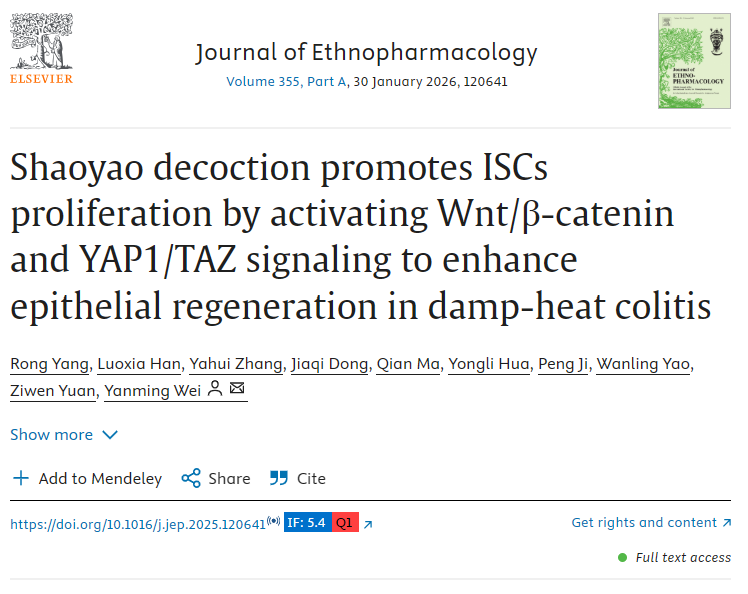 YangR,HanL,ZhangY,etal.ShaoyaodecoctionpromotesISCsproliferationbyactivatingWnt/β-cateninandYAP1/TAZsignalingtoenhanceepithelialregenerationindamp-heatcolitis.JEthnopharmacol.PublishedonlineSeptember25,2025.doi:10.1016/j.jep.2025.120641