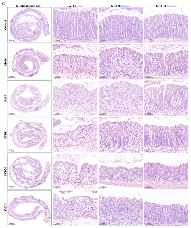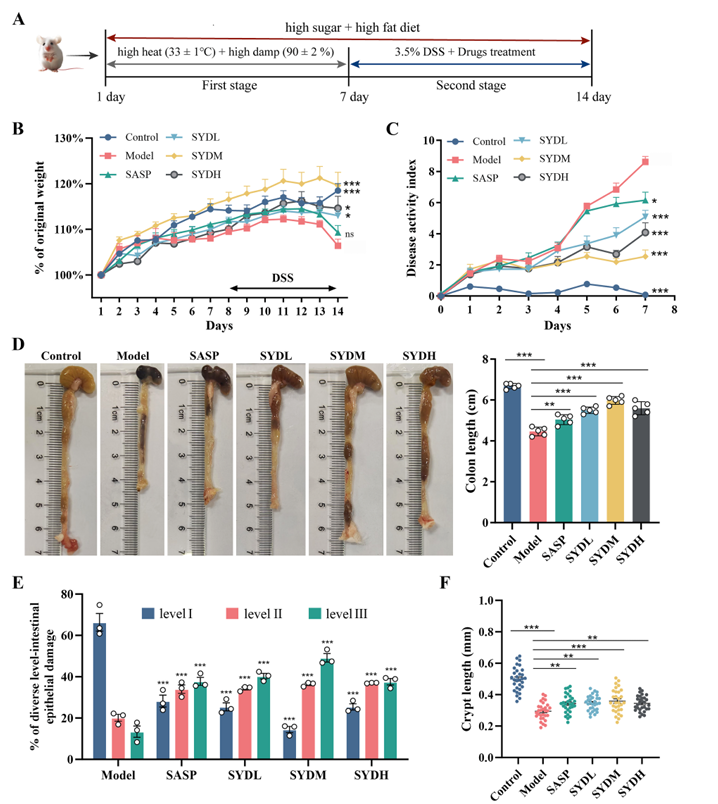 该研究首先通过液质联用技术(LC-MS/MS)鉴定出芍药汤提取物中包含91种化合物,涵盖黄酮类(22种)、萜类(13种)、苯丙素类(10种)等13个类别,其中丹皮酚、黄芩苷、小檗碱、甘草苷等已知活性成分,为其药理作用奠定了物质基础。随后,研究构建了“高糖高脂饮食+高温高湿环境+DSS诱导”的湿热型结肠炎小鼠模型,给予低、中、高剂量芍药汤及阳性药柳氮磺胺吡啶干预,结果显示芍药汤能显著改善模型小鼠的临床症状:减少体重下降幅度、降低疾病活动指数(DAI)、延长缩短的结肠长度,同时通过病理切片观察发现,芍药汤可减少结肠黏膜损伤,其中中剂量芍药汤效果优于阳性对照药。
