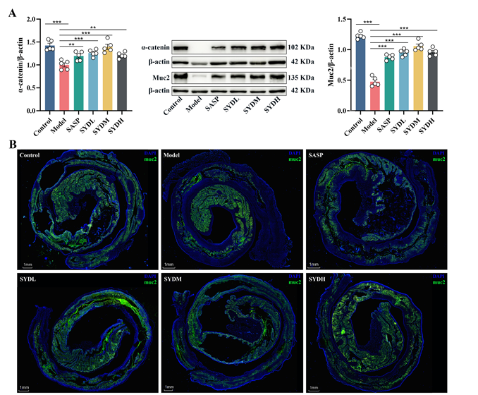 此外,芍药汤还能修复肠道黏液屏障:上调紧密连接蛋白α-catenin及黏液蛋白Muc2的表达,免疫荧光显示模型小鼠中远端结肠Muc2表达显著减少,而芍药汤处理后可恢复其表达;同时通过Wnt3a-YAP1-Hes1的共定位作用,促进杯状细胞分化,进一步加固黏液屏障,减少肠道内容物对黏膜的刺激。