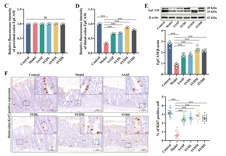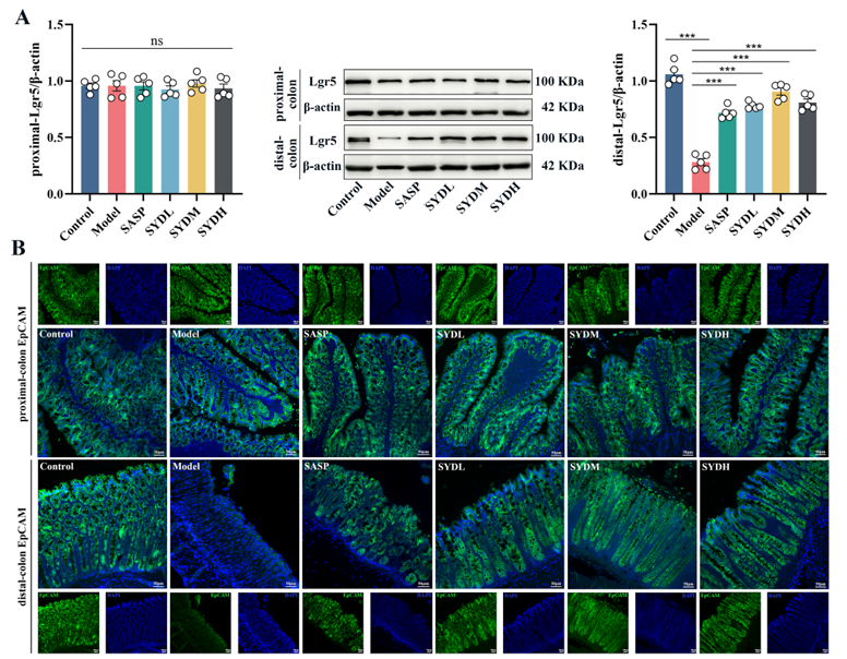 进一步研究发现,芍药汤具有明确的抗炎与促再生双重作用:一方面下调结肠组织中促炎因子IL-18、IL-21的蛋白和mRNA水平,减轻炎症反应;另一方面上调促上皮再生因子IL-22、IL-33及表皮生长因子(EGF)的表达,为肠上皮修复提供条件。同时,RT-qPCR和Westernblot结果显示,芍药汤能显著提高肠干细胞标志物Lgr5、增殖标志物Ki67及上皮特异性标志物EpCAM的表达,且这种上调主要集中在受损的远端结肠,提示芍药汤可特异性促进受损区域肠干细胞的增殖与上皮细胞更新。