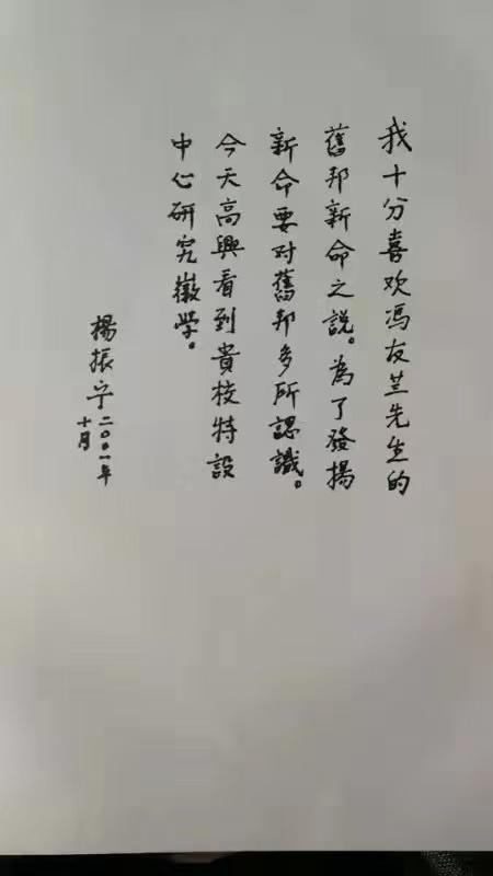 在章玉政的记忆中,2001年10月25日,杨振宁先生在安徽大学的访问中,为徽学研究中心题词道,“我十分喜欢冯友兰先生的旧邦新命之说,为了发扬新命要对旧邦多所认识。今天高兴看到贵校特设中心研究徽学。”在大礼堂演讲时,杨振宁还特意“秀”了几句合肥话,分享了他少年时在合肥四古巷的成长经历,尽显游子归乡的松弛与亲切。