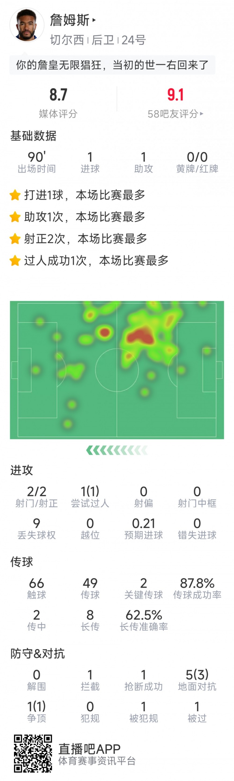 直播吧10月18日讯在本轮英超,切尔西3-0大胜诺丁汉森林。以下为里斯-詹姆斯本场比赛数据: