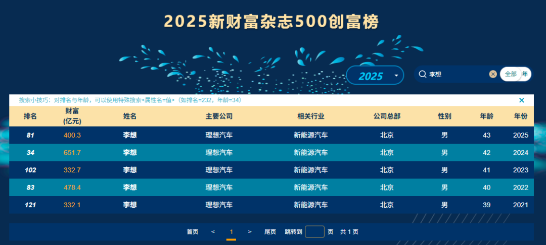 2025年,李想凭借400.3亿元身家位列新财富杂志500创富榜第81名。