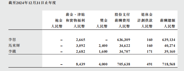 雷达财经查阅发现,“6.8亿港元”的出处来自于理想汽车2024年年报,换算成人民币为6.39亿元,包含266.5万元薪金津贴、16万元退休金计划供款以及6.36亿元股份支付薪酬。