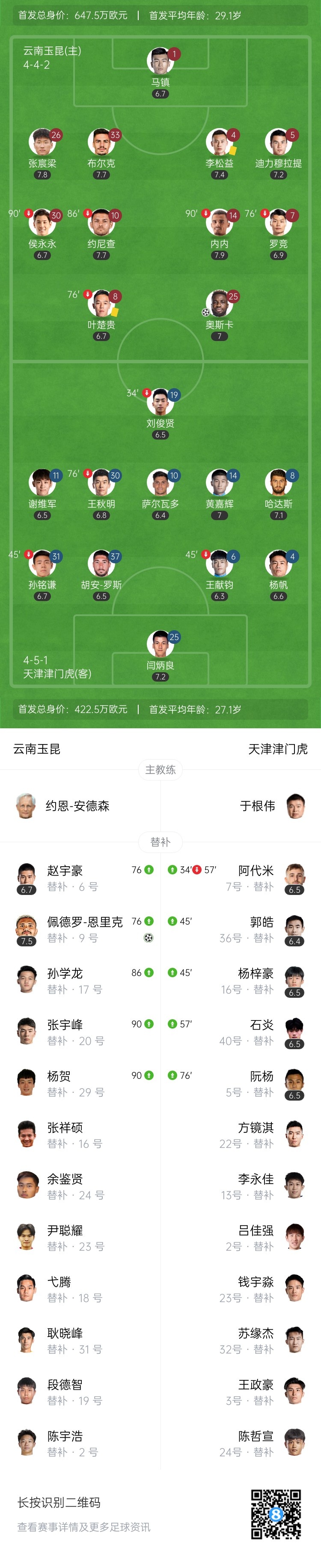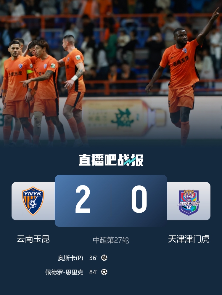 直播吧10月18日讯北京时间20:00,中超第27轮云南玉昆vs天津津门虎。上半场,王献均送点,奥斯卡点射破门!下半场,恩里克头球破门扩大领先优势!最终,云南玉昆2-0击败天津津门虎,近6轮首胜!