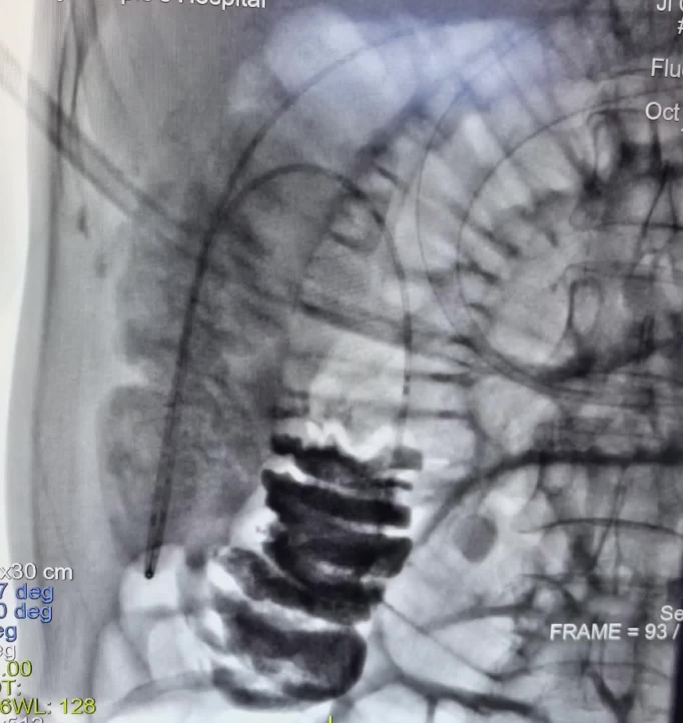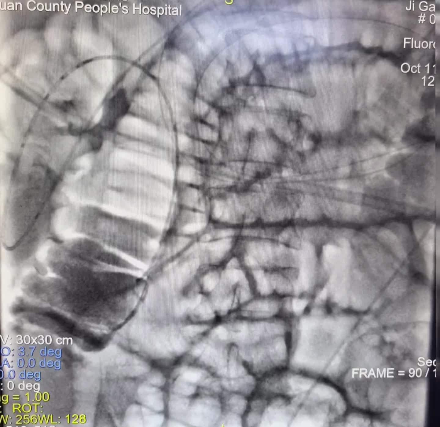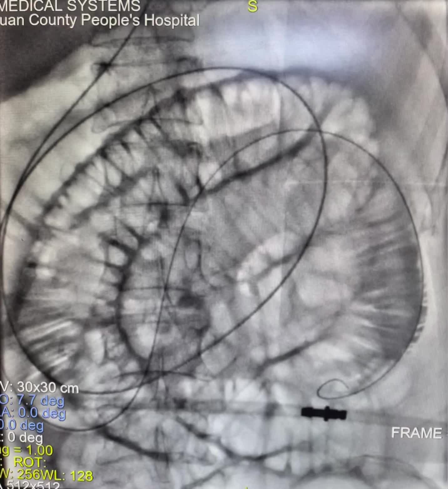 直肠癌术后3年,近期反复肠梗阻,胃管减压 直肠癌术后3年,近期反复肠梗阻,胃管减压1周,效果欠佳。今日在DSA可视化行肠管黏连松紧,及肠道减压管置入,直肠吻合狭窄扩张术,术后即可通便通气,腹胀,腹痛即可减轻。口。DSA可视化经鼻经肛双向开通,松解黏连介入治疗技术,安全有效,经自然腔道无创操做效果立竿见影。