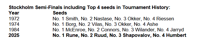 记者JoseMorgado(网球)报道,自1984年以来首次出现头号至四号种子共同晋级斯德哥尔摩站半决赛的情况。看看这份球员名单!