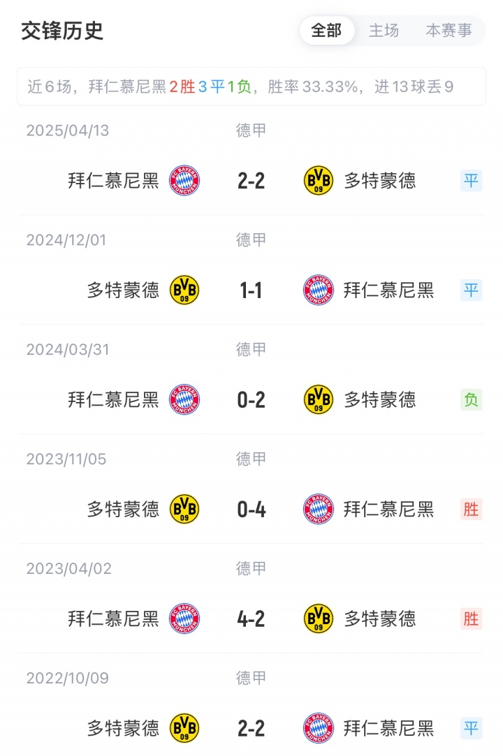 拜仁联赛6轮全胜积18分位居德甲榜首,开季各赛事已获10连胜;多特联赛4胜2平积14分,开季各赛事9场比赛同样全部保持不败。拜仁对阵多特已3场不胜(2平1负)。