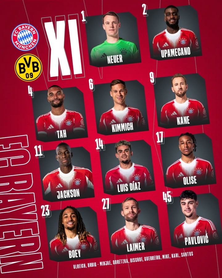 拜仁慕尼黑首发:1-诺伊尔、2-于帕梅卡诺、4-塔、23-博伊、6-基米希、27-莱默尔、45-帕夫洛维奇、9-凯恩、11-杰克逊、14-迪亚斯、17-奥利塞