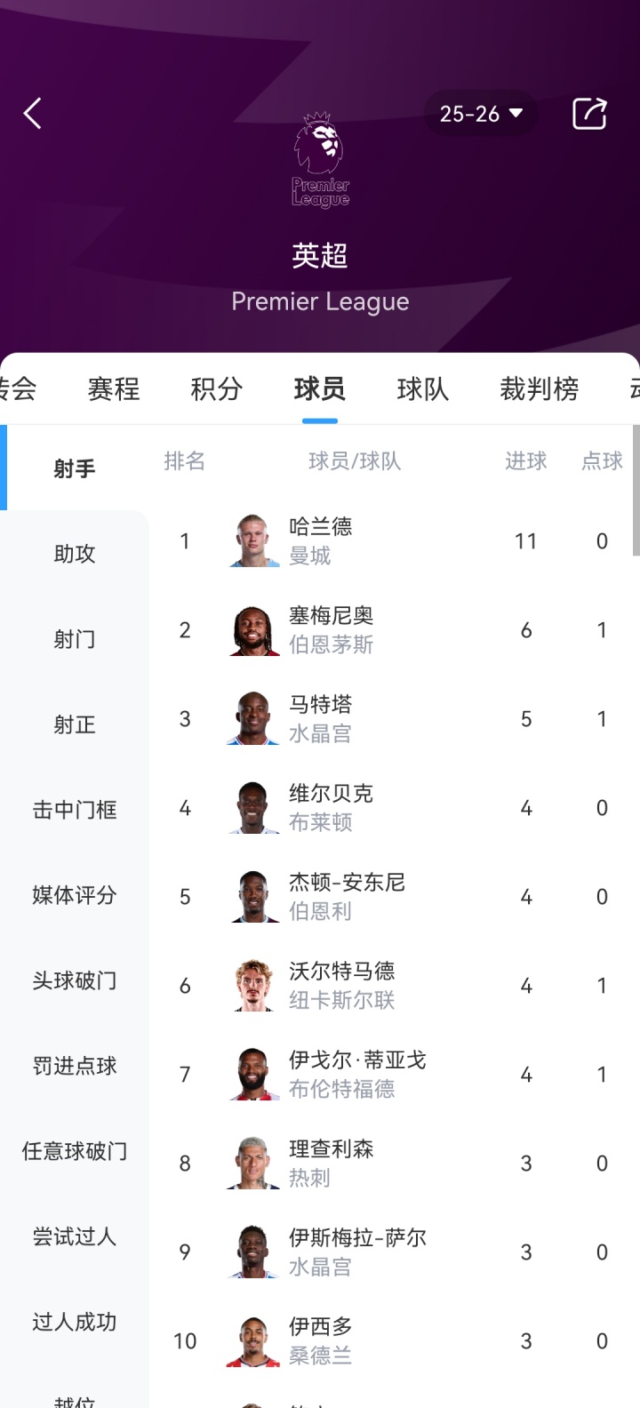 直播吧10月19日讯英超第8轮部分比赛结束,最新的英超射手榜:哈兰德11球领跑,本轮比赛打进2球实现联赛进球数上双;塞梅尼奥6球第2,马特塔凭借本轮联赛的帽子戏法进球来到5个,在射手榜上位居第3名。维尔贝克、杰顿-安东尼、沃尔特马德、伊戈尔-蒂亚戈均打进4球,并列第4。