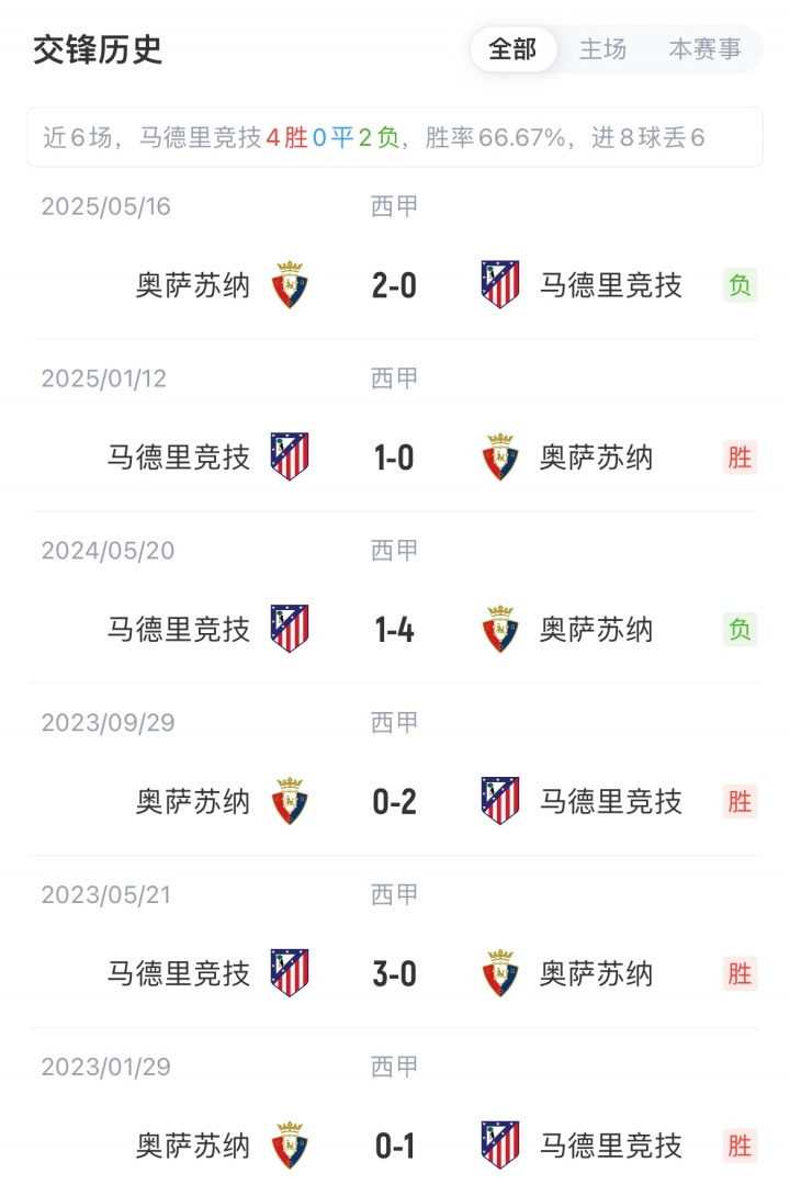 马竞联赛3胜4平1负积13分,主场各赛事已收获4连胜;奥萨苏纳联赛3胜1平4负积10分,客场遭遇4连败。双方上一次交锋马竞客场0-2不敌奥萨苏纳。