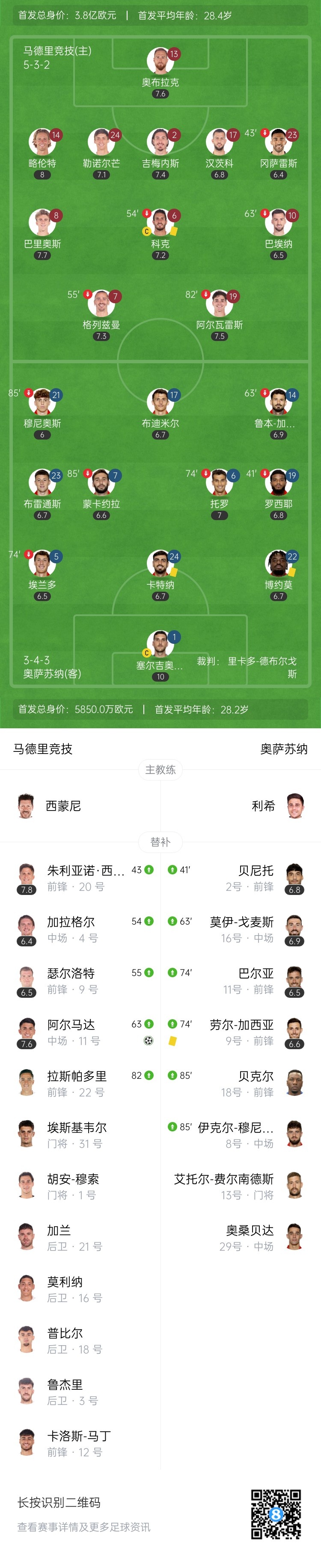 下半场补时3分钟。最终全场比赛结束,马竞1-0奥萨苏纳。