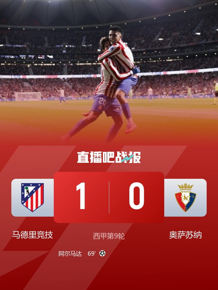 直播吧10月19日讯西甲第9轮,马德里竞技坐镇主场西维塔斯大都会球场迎战奥萨苏纳。上半场,巴埃纳破门被吹,格列兹曼失良机。易边再战,阿尔瓦雷斯失良机,瑟尔洛特头球造险,小西蒙尼助攻阿尔马达处子球制胜。最终马竞1-0奥萨苏纳。积分榜方面,马竞16分暂升第四,奥萨苏纳10分第十二。