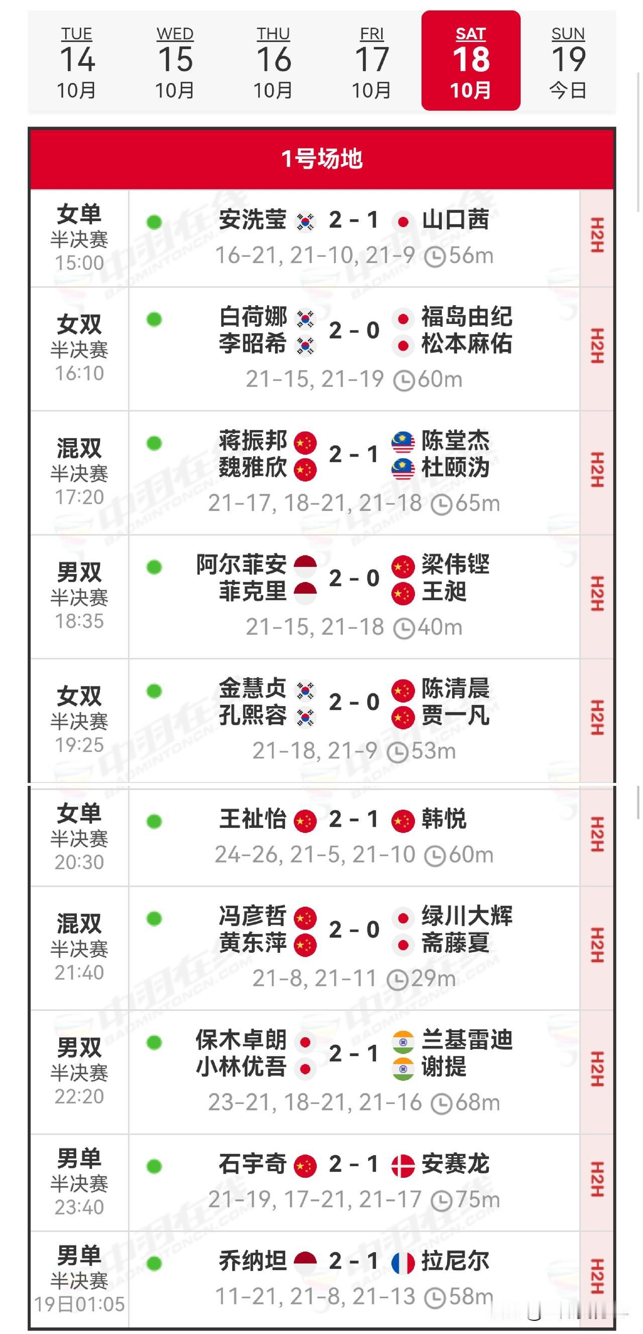 19日赛程及18日赛况2025年丹麦羽毛球公开赛 2025年丹麦羽毛球公开赛的决赛于10月19日北京时间18:00挥拍开赛,国羽力争3金,混双项目已提前锁定冠亚军! 男单在第5场,石宇奇对对阵乔纳坦,双方有过18次交手,各胜9场,最近一次交手在2024年总决赛小组赛,石头2-1拿下对手。 女单(第3场),王祉怡对阵安洗莹,双方全是老对手了,此前17次交手,王祉怡4胜13负,在今年5次决赛中,小王不敌小安子,期待着小王此站有所突破。 男双(第4场),由印尼的阿尔菲安/菲克里对阵日本的保木卓朗/小林优吾,双方之前没有交手过。 女双(第1场),韩国内战,白何娜李绍希对阵孔熙容/金慧贞,双方交手4次,金孔组合取得全胜! 混双(第2场),冯彦哲/黄东萍与队友蒋振邦魏雅欣对决,双方第16次交手,此前凤凰组合12胜3负,最近一次在上周北极公开赛决赛,振欣组合夺冠。 18日半决赛,梁伟铿/王昶0-2负于对手,还是未能突破阿尔菲安/菲克里这一关,陈清晨/贾一凡0-2孔熙容/金慧贞,韩悦被王祉怡逆转,乔纳坦2-1逆转法国小将拉尼尔。