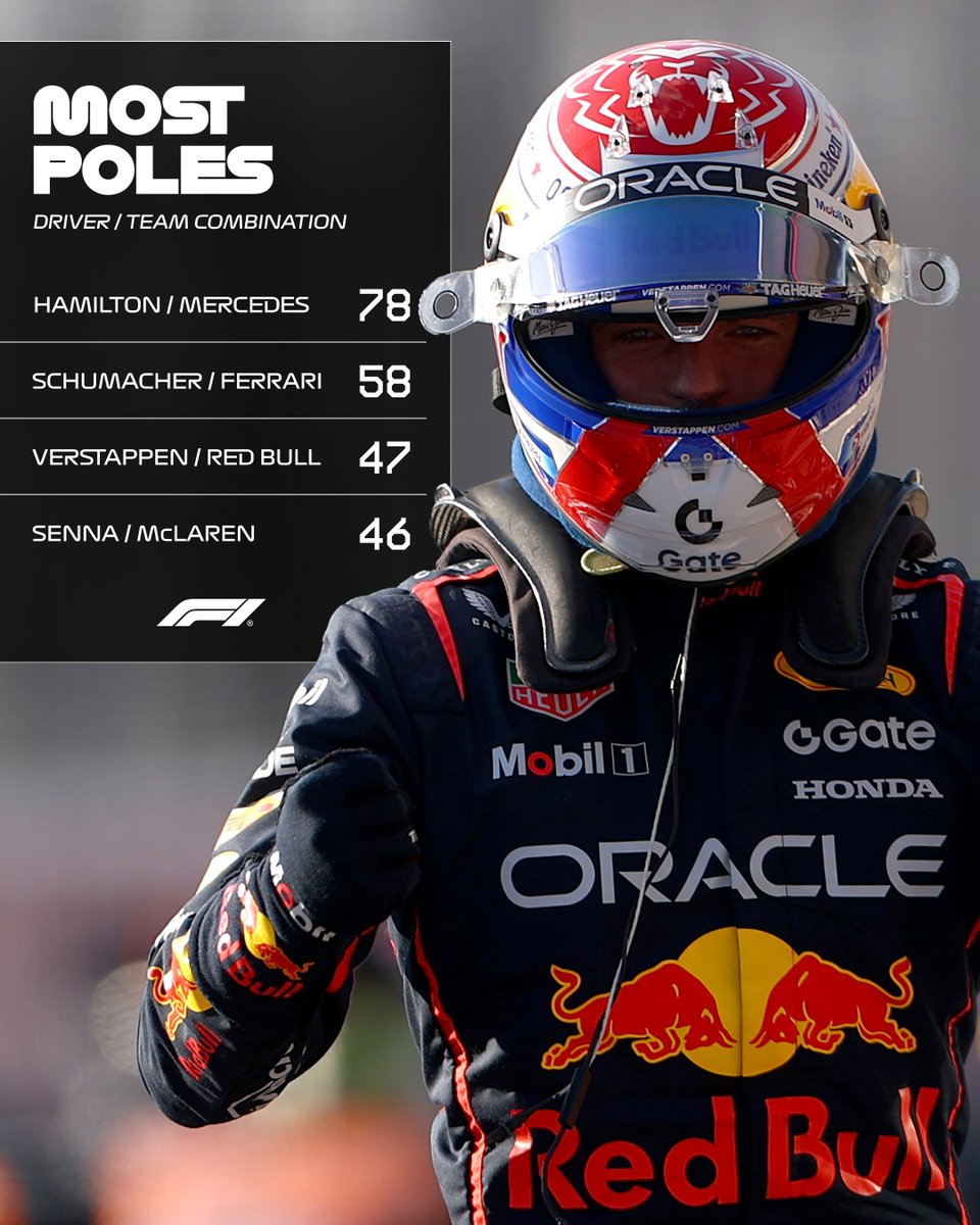 F1官方推特账号报道,马克斯·维斯塔潘以47次杆位超越埃尔顿·塞纳为迈凯伦创造的46次杆位纪录,成为单一车队(红牛)杆位数最多的车手。#F1#USGP