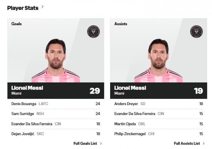 2025常规赛,梅西28场收获29球19助,目前双双霸榜美职联常规赛的射手榜和助攻榜。