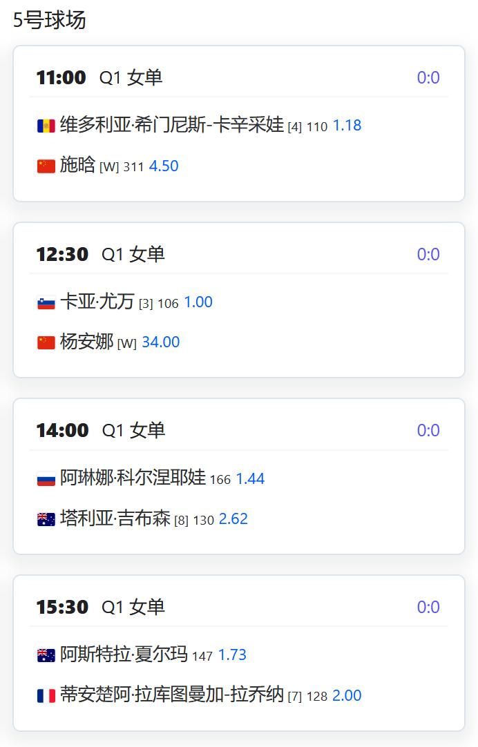 今日赛程: WTA250赛广州站,女单资格赛第一轮,高馨妤将对阵5号种子卡瓦; 韦思佳将对阵12号种子科帕奇; 李昱瑶将对阵6号种子孙璐璐; 施晗将对阵4号种子卡辛采娃; 杨安娜对阵3号种子尤万; CH75深圳,男单决赛,周意将与3号种子雅凯争夺冠军; W35湖州,王佳祺将与资格赛球员霍姆奇安斯卡娅争夺女单冠军。