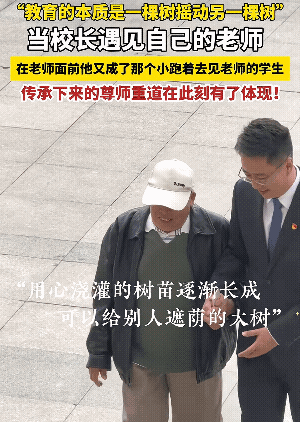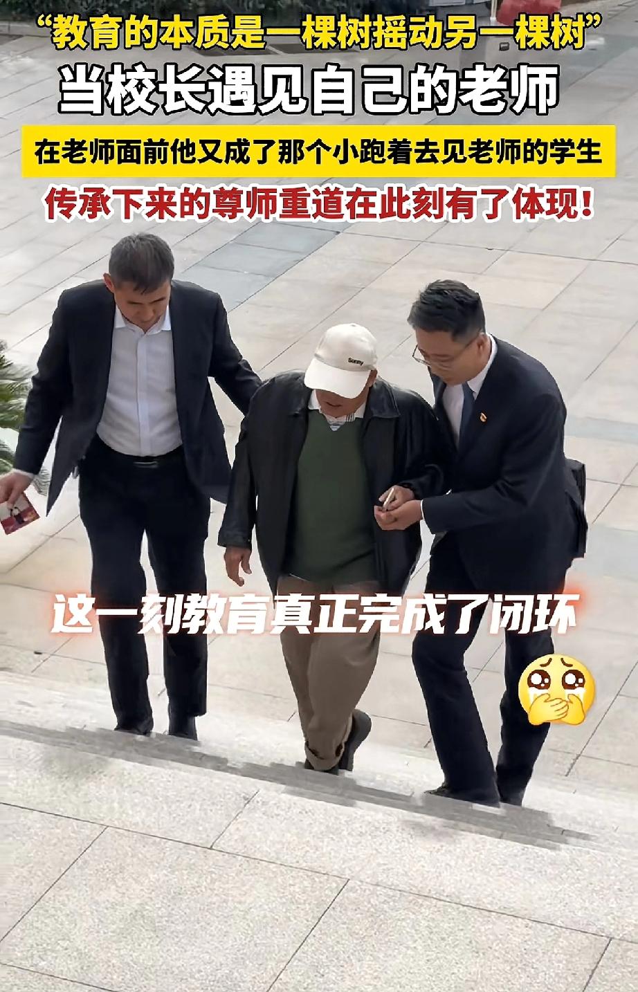 “感动!”青岛海山学校校长看到自己的老师,仍然很谦卑。传承下来的尊师重道在此刻,具象化了。 在老师面前,校长又成了那个小跑着去见老师的学生。看见老师校长笑的合不拢嘴。相信当初老师对他一定非常的好。校长肯定受到老师的影响,现在是一名优秀的教育人。正所谓“教育的本质就是一棵树动摇另外一棵树”。 网友们看到这样的画面,纷纷留言说:“当自己成为校长,遇见那个影响了自已一生的老师,像学生时一样小跑去迎接!贵为校长的学生怎能不开心嘛!此刻校长成为了乖乖学生啦!这是老人家的高光时刻!” 还有网友说:“现在和我初中的老师成同事了,在他们面前始终谦卑的态度,那是我从心底对他们的尊重,他们也很关心我,一日为师,终身感念,教书,是一代人在温暖一代人,一代人在传承一代人,愿尊师重道在这条路上不泯灭。” 这才是教育的意义,不仅仅是只有成绩和分数,还有德育。相信校长所带的老师能教育出更多好学生。传承中华美德。 对此,你怎么看?