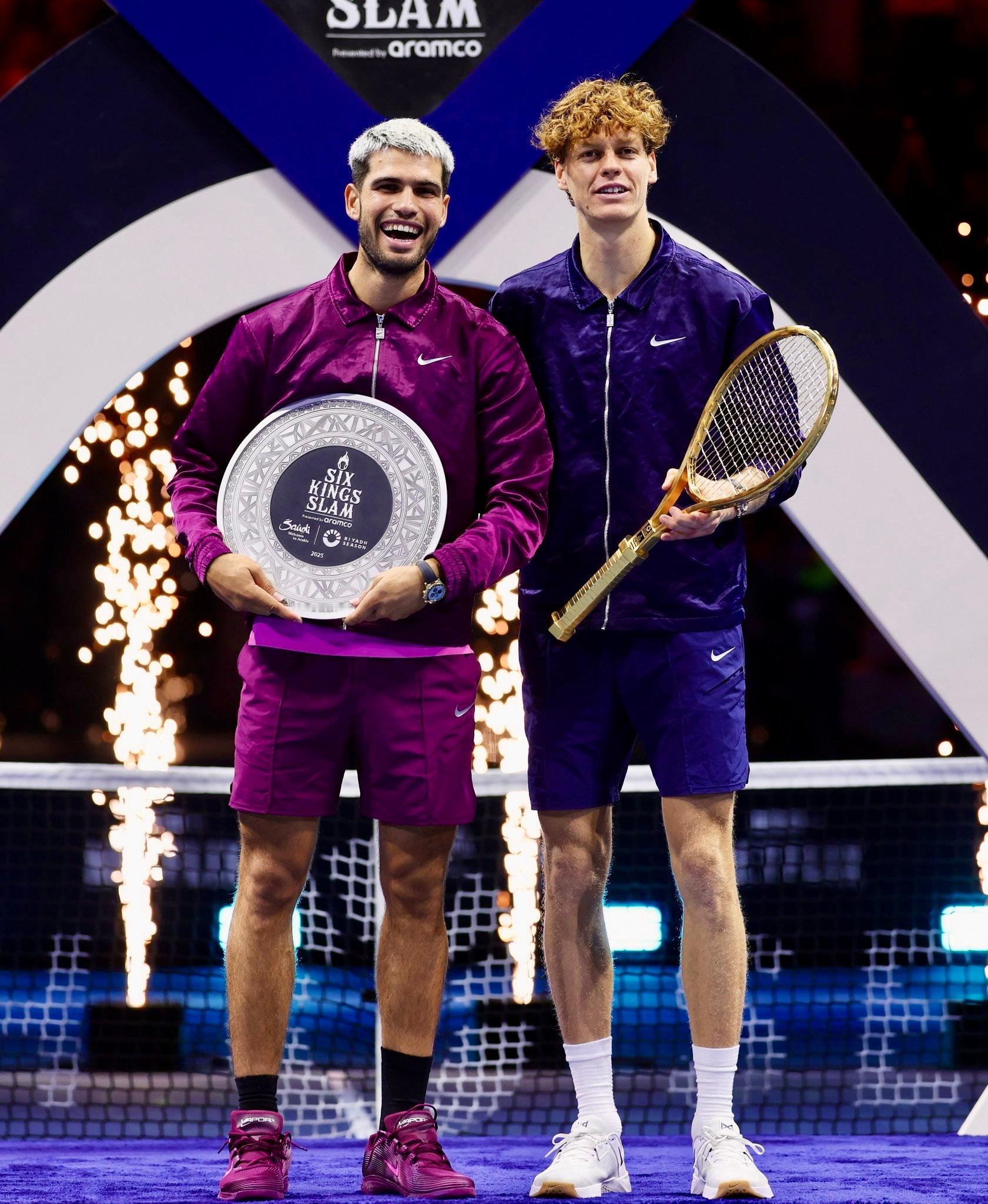 辛纳在沙特六王赛的决赛中以6-2、6-4击败阿卡,全程无破发点,除了独自收获600万美元的巨额奖金之外,还得到了一把3千克24K纯金打造的球拍,价值30万美元左右。