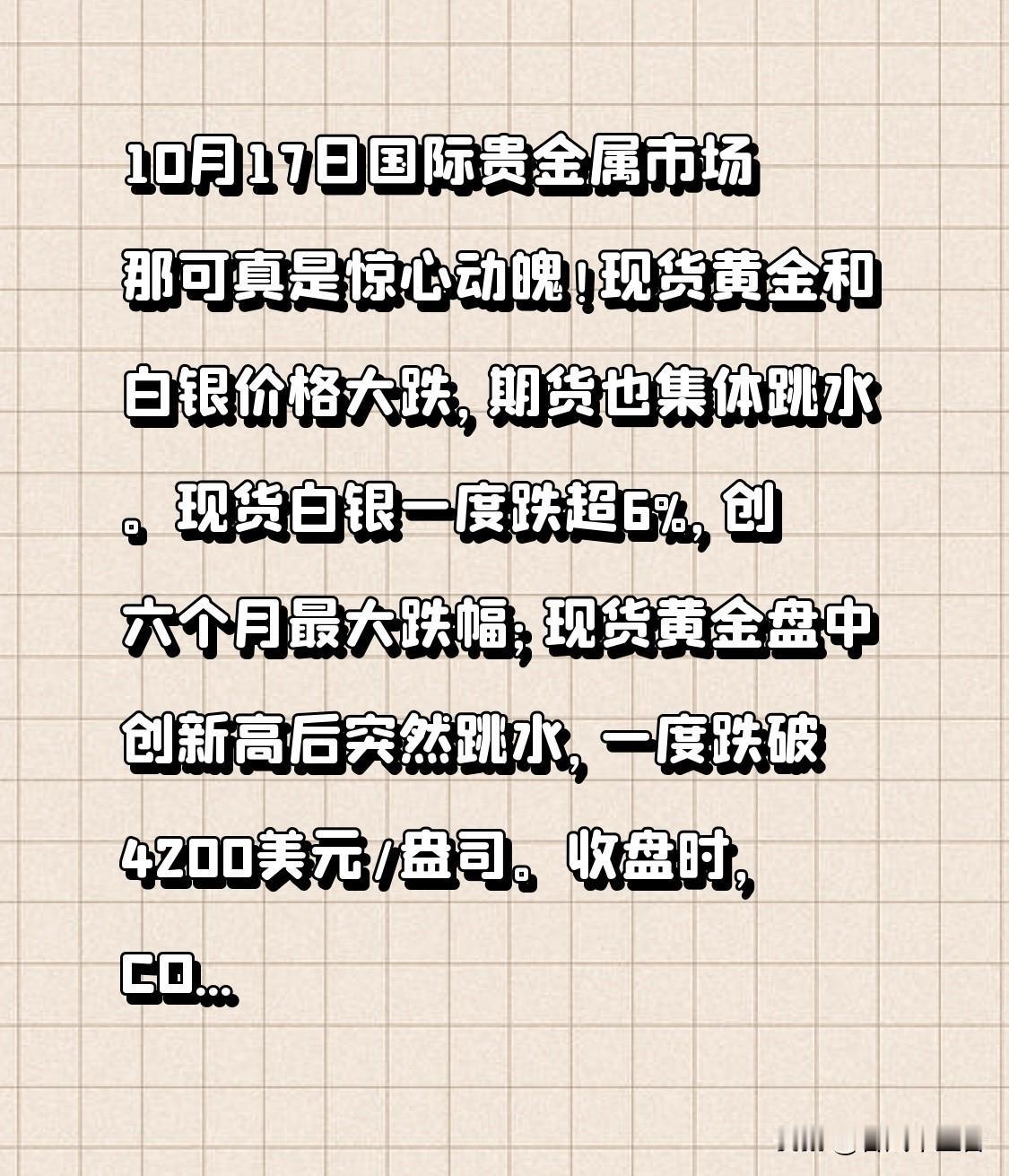 快讯,黄金白银降价了!是跳楼价!10月17日国际贵金属市场那可真是惊心动魄!现货黄金和白银价格大跌,期货也集体跳水。现货白银一度跌超6%,创六个月最大跌幅;现货黄金盘中创新高后突然跳水,一度跌破4200美元/盎司。收盘时,COMEX白银期货跌超5%,NYMEX钯金期货主力大跌超9%,NYMEX铂金期货主力大跌超7%。 这一跌可把网友急坏了,有人刚买就跌,直呼“刺激”。国内金饰价格也跟着下调,老庙黄金单日下调28元,周生生下调15元。主要原因是拥挤交易和政策调控,市场对地缘政治等担忧缓解,避险需求下降。不过汇丰银行预计金价上涨行情能延续到2026年,但美联储降息情况还存在不确定性。