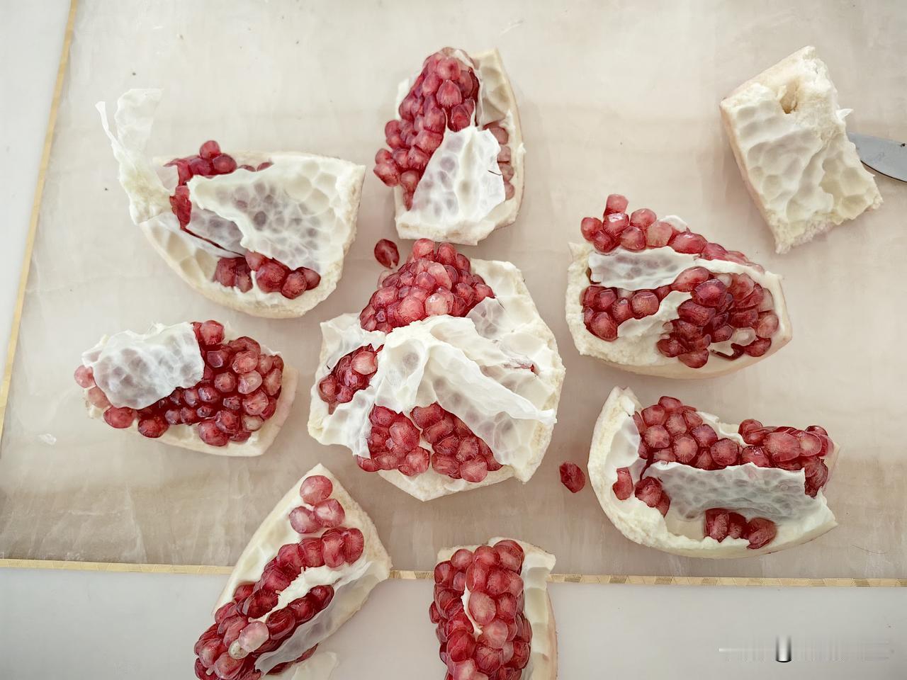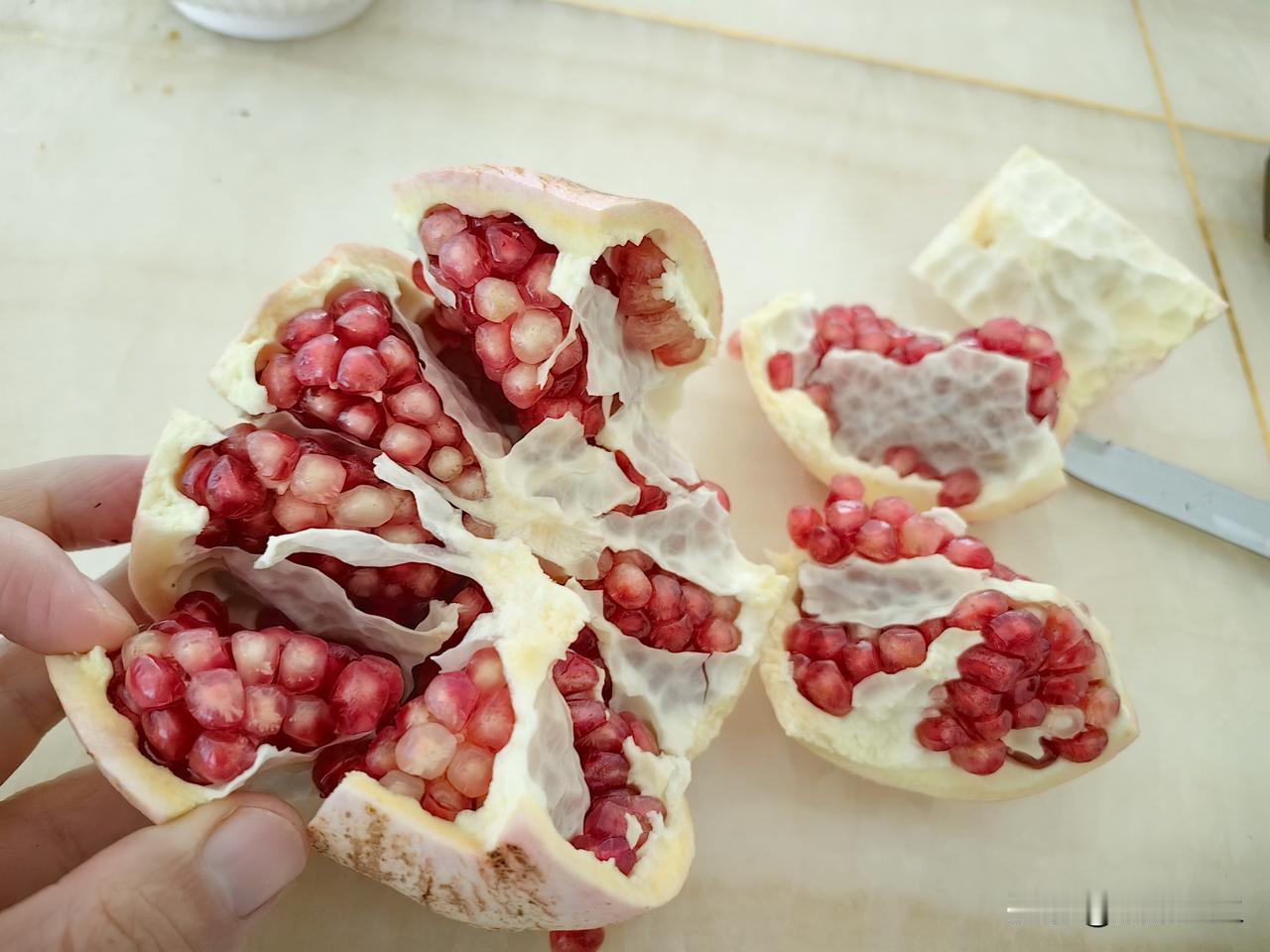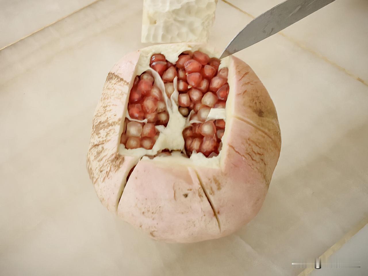 吃石榴妙招,学会不浪费一粒石榴籽。 用刀在石榴花四周四刀划开,用刀尖撬开,再用刀找到石榴分房隔片,由上至下划一刀,用手轻轻分别将石榴掰开,大概就六,七房左右,这么剥开石榴就特别方便,而且一粒也不浪费,具体大家看图片操作,欢迎谈谈使用后效果。