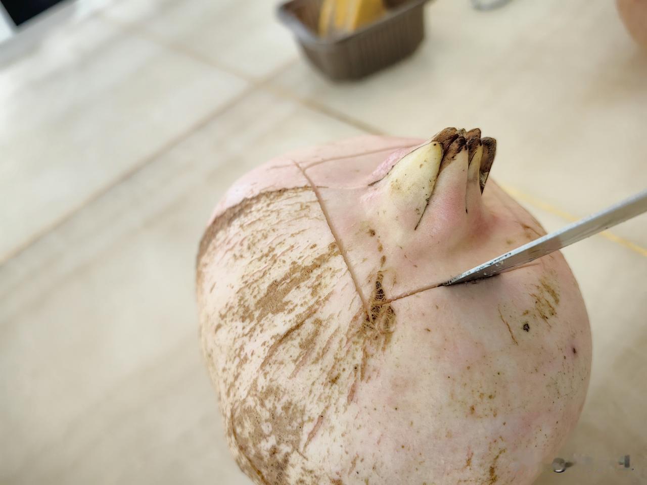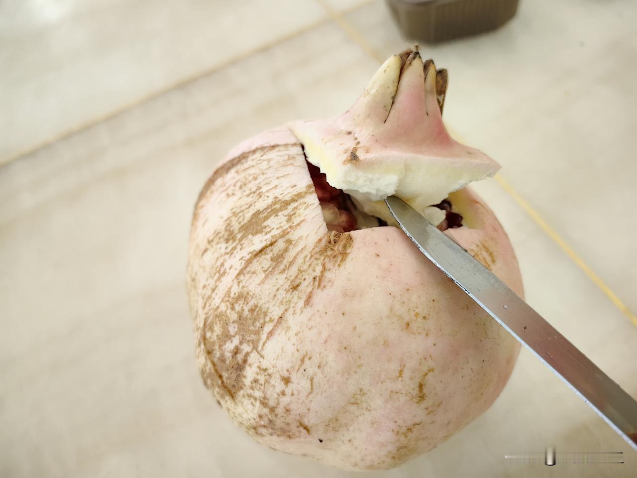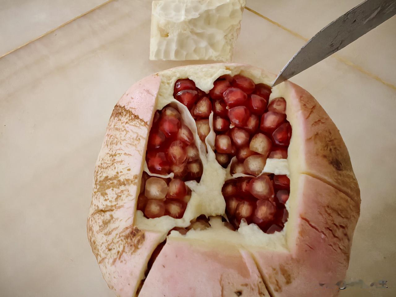 吃石榴妙招,学会不浪费一粒石榴籽。 用刀在石榴花四周四刀划开,用刀尖撬开,再用刀找到石榴分房隔片,由上至下划一刀,用手轻轻分别将石榴掰开,大概就六,七房左右,这么剥开石榴就特别方便,而且一粒也不浪费,具体大家看图片操作,欢迎谈谈使用后效果。
