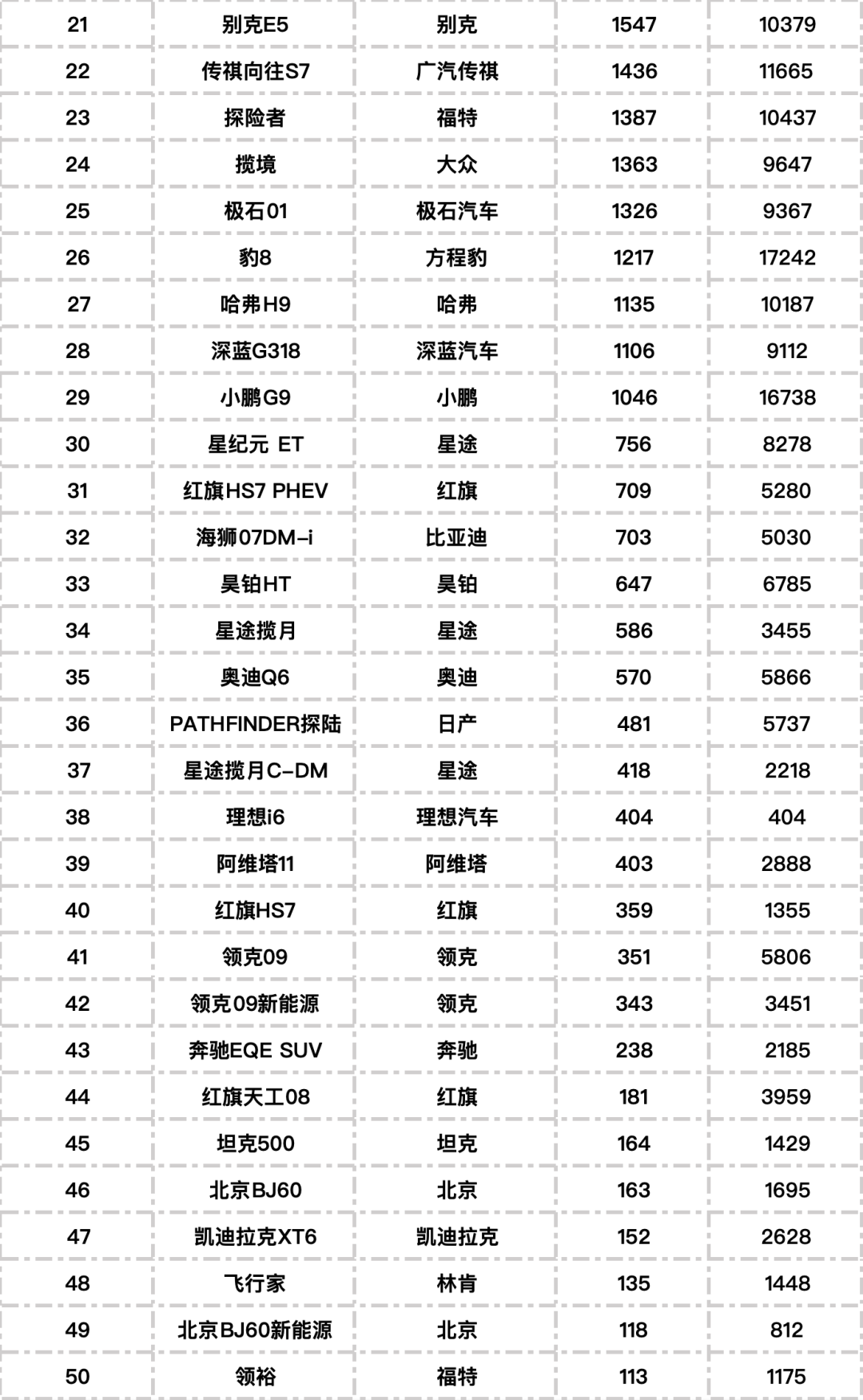 其它车型方面,智界R7为4788辆,岚图FREE为4553辆,东风eπ008为3522辆,魏牌蓝山为2805辆。