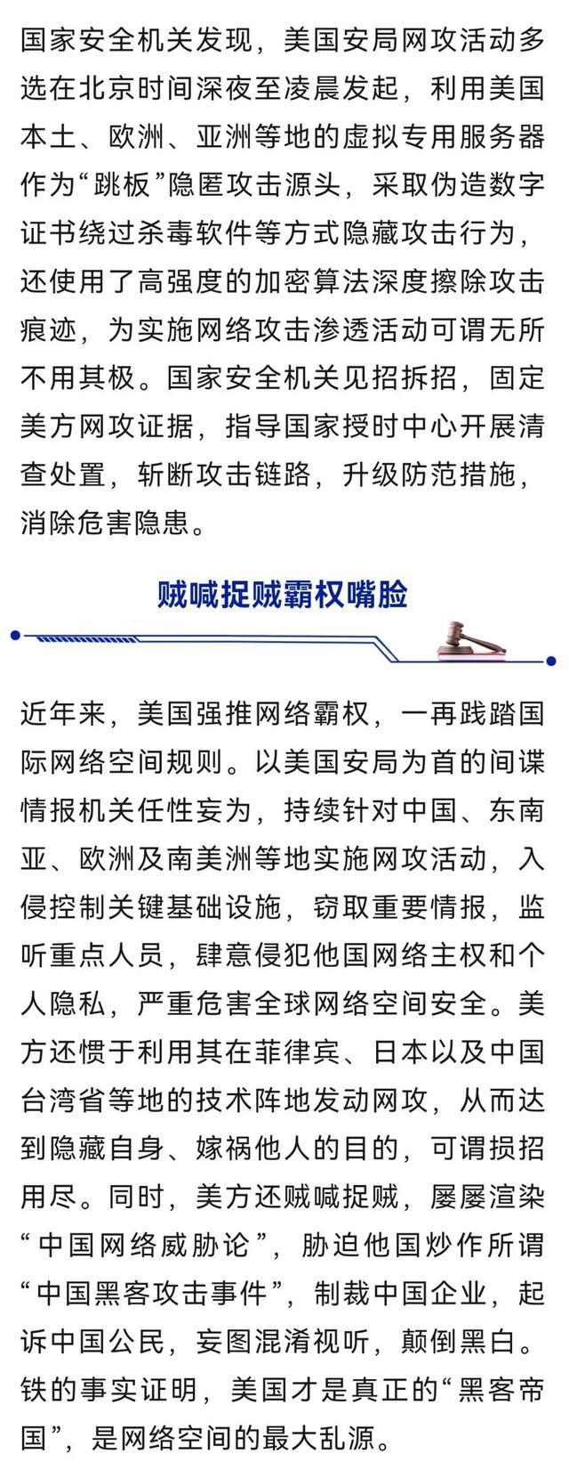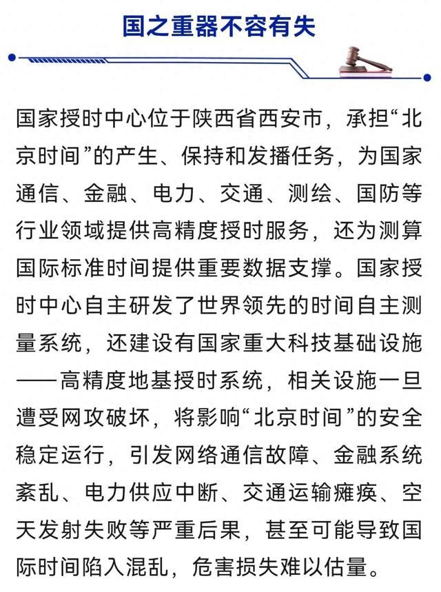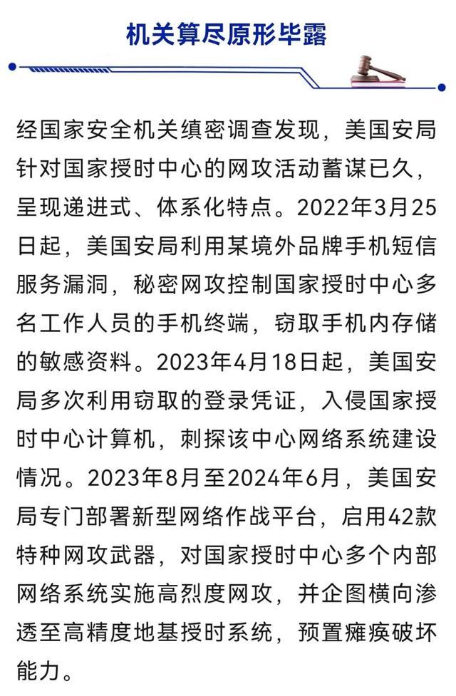 从国家安全部了解到,近期,国家安全机关破获一起美国重大网络攻击案,掌握美国国家安全局网络攻击入侵中国国家授时中心的铁证,粉碎美方网攻窃密和渗透破坏的图谋,全力守护“北京时间”安全。