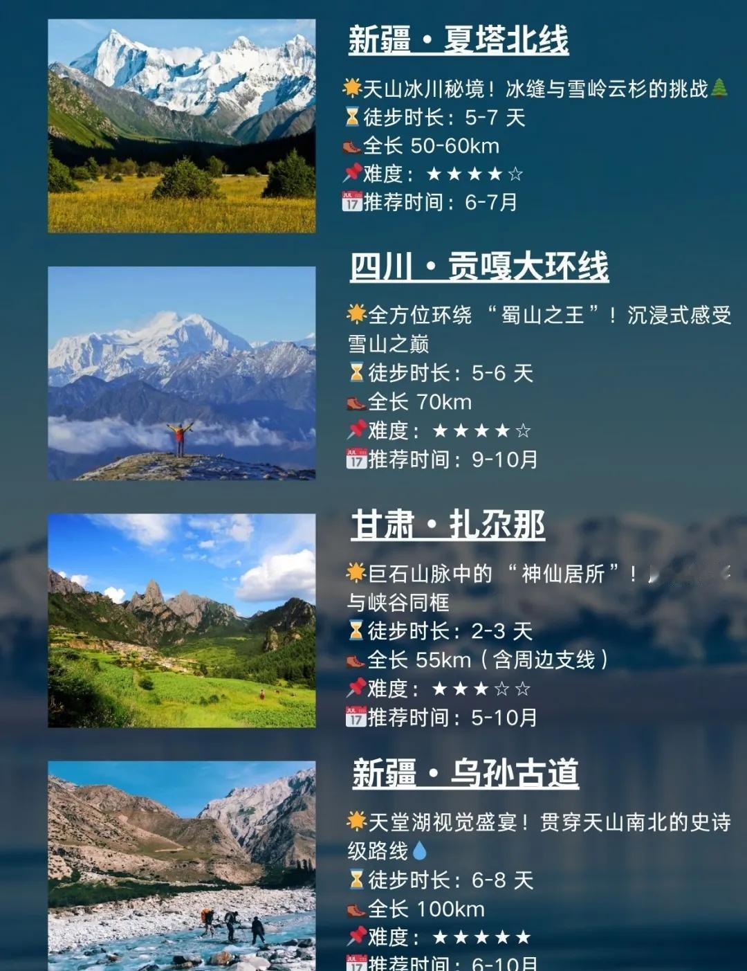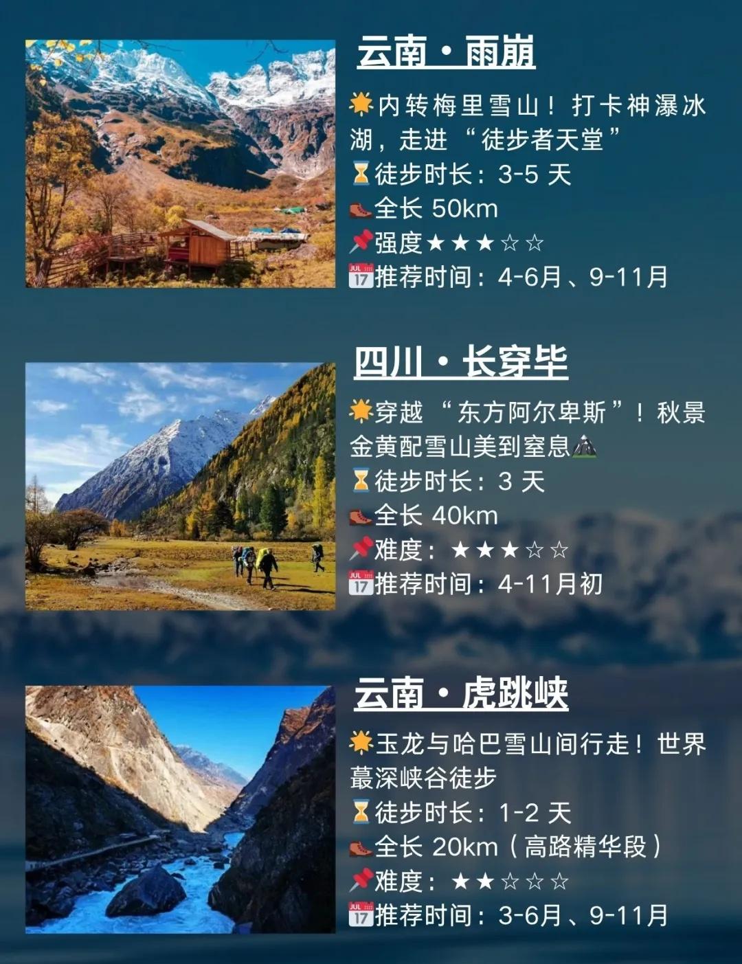 国内 | 10大经典徒步路线🔥你挑战过几条 - 徒步佬速速集合❗是时候用双脚丈量祖国的大好河山了🏞路书整理了10条【此生必徒】的经典徒步路线🏔从雪山秘境到诗画草原🐂🐎快来看看你打卡过几条?接下来想挑战哪条? - 1️⃣ 云南·雨崩 “不去天堂,就去雨崩”!内转梅里雪山,探访神瀑、冰湖秘境,这里是徒步爱好者的天堂 🚶里程:约50公里|⭐难度:入门级 · 2️⃣ 四川·长穿毕 穿越“东方阿尔卑斯”,从长坪沟到毕棚沟,体验从森林到雪山的景观更迭🏔 🚶里程:约40公里|⭐难度:中级 · 3️⃣ 云南·虎跳峡 在玉龙与哈巴雪山间,行走于世界最深的峡谷之一,感受金沙江的奔腾汹涌 🚶里程:约20公里|⭐难度:初级 · 4️⃣ 新疆·夏塔古道北线 穿越天山腹地,沿着古道追寻雪岭云杉🌲与木扎尔特冰川的壮丽 🚶里程:约50-60公里|⭐难度:进阶 · 5️⃣ 四川·贡嘎大环线 全方位环绕“蜀山之王”,感受雪山之巅的震撼,是中国最美的十大名山之一 🚶里程:约70公里|⭐难度:挑战级 · 6️⃣ 甘肃·扎尕那 穿越隐藏在巨石山脉中的“神仙居所”,感受原始村落与峡谷的宁静 🚶里程:约55公里|⭐难度:中级 · 7️⃣ 新疆·乌孙古道 以惊艳绝伦的天堂湖闻名,贯穿天山南北的视觉盛宴,是新疆顶级徒步线路 🚶里程:约100公里|⭐难度:挑战级 · 8️⃣ 西藏·冈仁波齐转山 藏传佛教朝圣之旅,沿途欣赏神山不同角度的雄姿,感受信仰的力量 🚶里程:约52公里|⭐难度:进阶 · 9️⃣ 川西·洛克秘境 追寻探险家洛克足迹,穿越木里至亚丁,仰望三神山,寻找最后的香格里拉 🚶里程:约65公里|⭐难度:挑战级 · 🔟 西藏·库拉岗日转山 屹立于西藏山南,邂逅雪山与圣湖交相辉映的秘境,一次看够雪山圣湖 🚶里程:约36公里|⭐难度:中级 - 💡【徒步小贴士】 ✅ 新手建议从虎跳峡、雨崩等入门路线开始 ✅ 高原徒步注意防晒防高反,备好防晒霜、太阳镜等 ✅ 装备要专业:徒步鞋、冲锋衣、登山杖、头灯是必备 ✅ 最佳季节:春秋两季是大多数路线的最佳徒步时间 - 👇快加入群聊,好玩好游不迷路~ - - 指北旅行 徒步丈量世界 徒步路线推荐 户外徒步旅行 徒步天花板 国内徒步 雨崩 川西 徒步圈