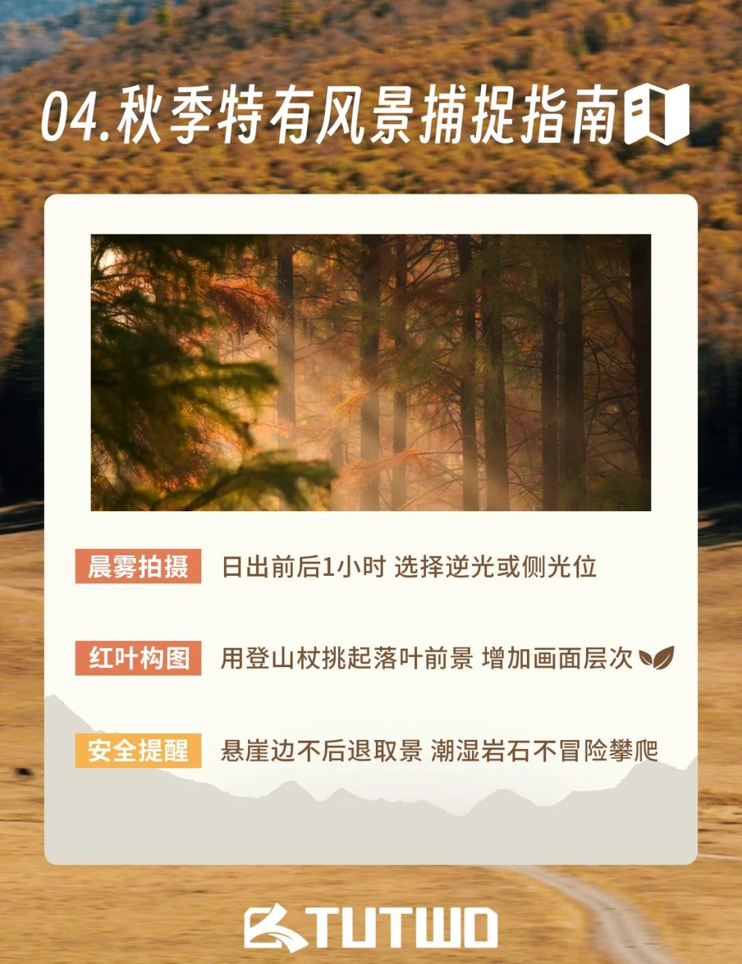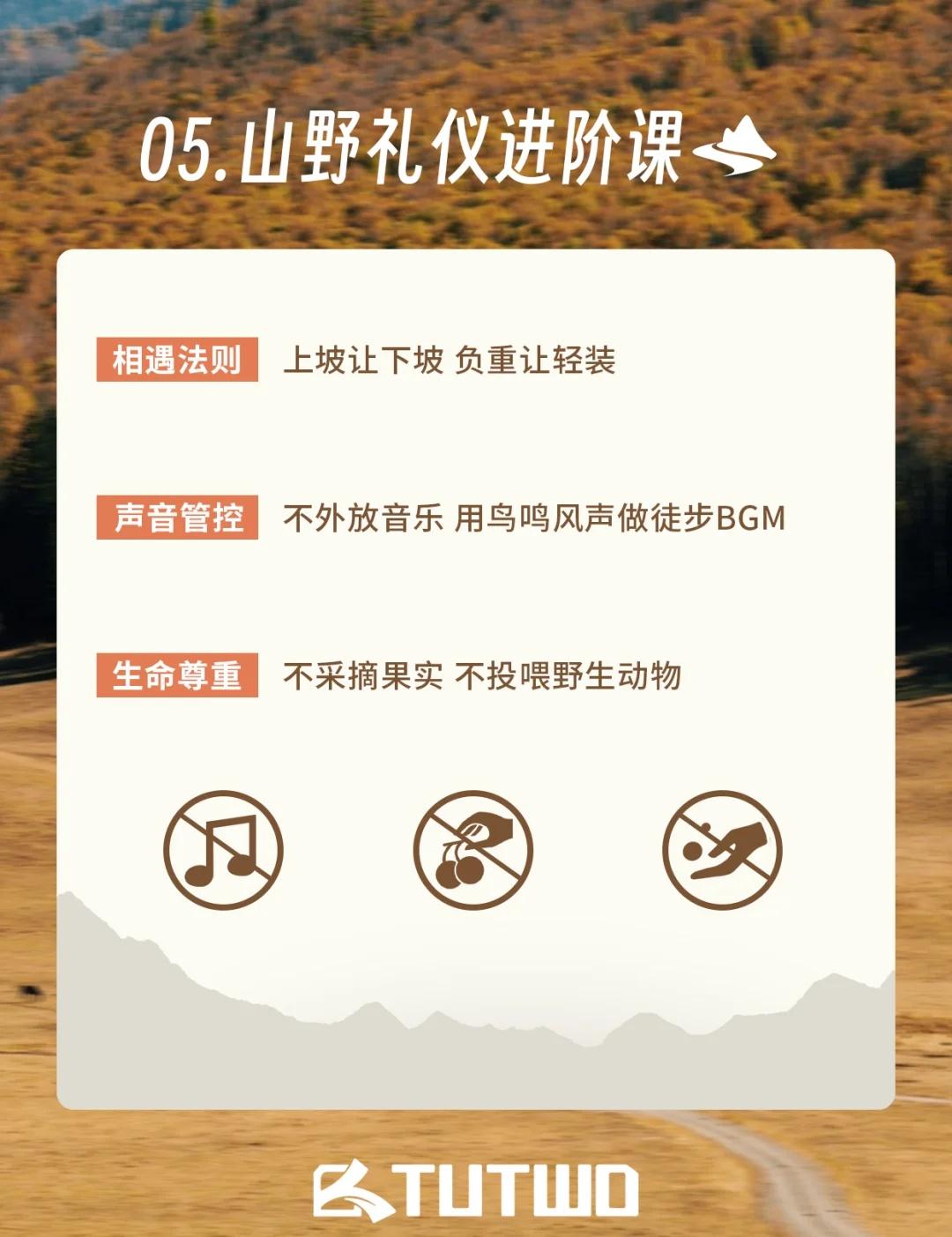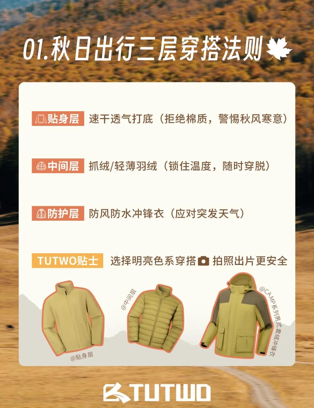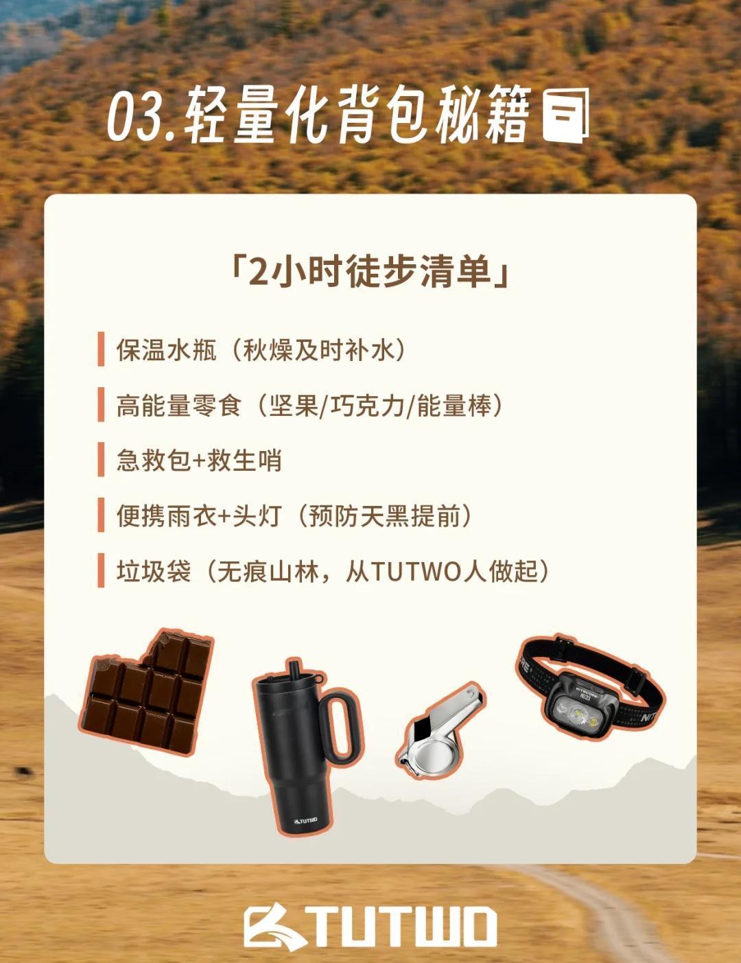 TUTWO图途秋季轻户外|唤醒你的山野DNA! 亲爱的@TUTWO图途“途友”们, 秋意渐浓,山色斑斓,正是走出城市、拥抱自然的黄金季节。 作为你的轻户外伙伴, @TUTWO图途 为你准备了这份「秋季户外干货指南」 ——无需专业硬核,只需一颗向往自由的心。 �� 秋日出行三层穿搭法则 • 贴身层:速干透气打底(拒绝棉质,警惕秋风寒意) • 中间层:抓绒/轻薄羽绒(锁住温度,随时穿脱) • 防护层:防风防水冲锋衣(应对突发天气) ✨ TUTWO贴士:选择明亮色系穿搭,拍照出片更安全 �� 徒步关键:双脚的满分呵护 • 选鞋标准:防滑底+踝部支撑+轻量化(应对湿滑落叶与碎石路) • 穿鞋秘诀:提前穿厚袜试鞋,下山时脚趾前留一指空间 • 必备动作:行前拉伸脚踝,行后放松小腿 �� 轻量化背包秘籍 「2小时徒步清单」: ✓ 保温水瓶(秋燥及时补水) ✓ 高能量零食(坚果/巧克力/能量棒) ✓ 急救包+救生哨 ✓ 便携雨衣+头灯(预防天黑提前) ✓ 垃圾袋(无痕山林,从TUTWO人做起) �� 秋季特有风景捕捉指南 • 晨雾拍摄:日出前后1小时,选择逆光或侧光位 • 红叶构图:用登山杖挑起落叶前景,增加画面层次 • 安全提醒:悬崖边不后退取景,潮湿岩石不冒险攀爬 �� 山野礼仪进阶课 • 相遇法则:上坡让下坡,负重让轻装 • 声音管控:不外放音乐,用鸟鸣风声做徒步BGM • 生命尊重:不采摘果实,不投喂野生动物 这个秋天,@TUTWO图途 与你相约: 不必征服群山,只需走进自然 在铺满银杏的古道漫步 在晨雾弥漫的山脊深呼吸 让轻型装备承载轻松心情 让每一片红叶都成为旅途的勋章 评论区互动: 分享你的「秋日徒步必带神器」 抽3位“途友”赠送新款户外装备礼包 徒步圈 TUTWO图途 TUTWO图途说走就走的勇气 TUTWO图途轻装上阵走更远 户外知识 图途户外 轻户外风格