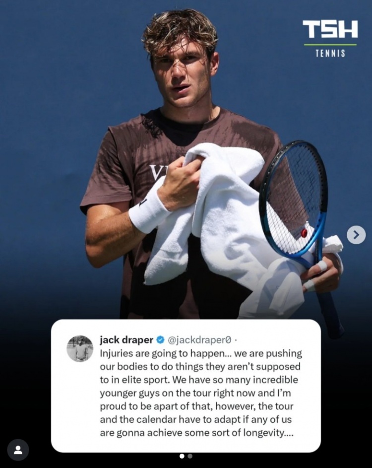对此,英国网球运动员杰克-德雷珀表示:“伤病难免……在精英运动中,我们总是强迫自己的身体去做一些它们不该做的事情。现在巡回赛上有很多优秀的年轻人,我很自豪能成为其中的一员。然而,如果我们中的任何一个人想要达到某种程度的‘长寿’,巡回赛和赛程就必须做出调整……”