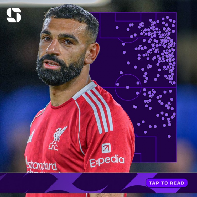 Squawka指出,萨拉赫本赛季表现不佳,他平均每90分钟只有5.6次对方禁区内触球和1.3次射门。