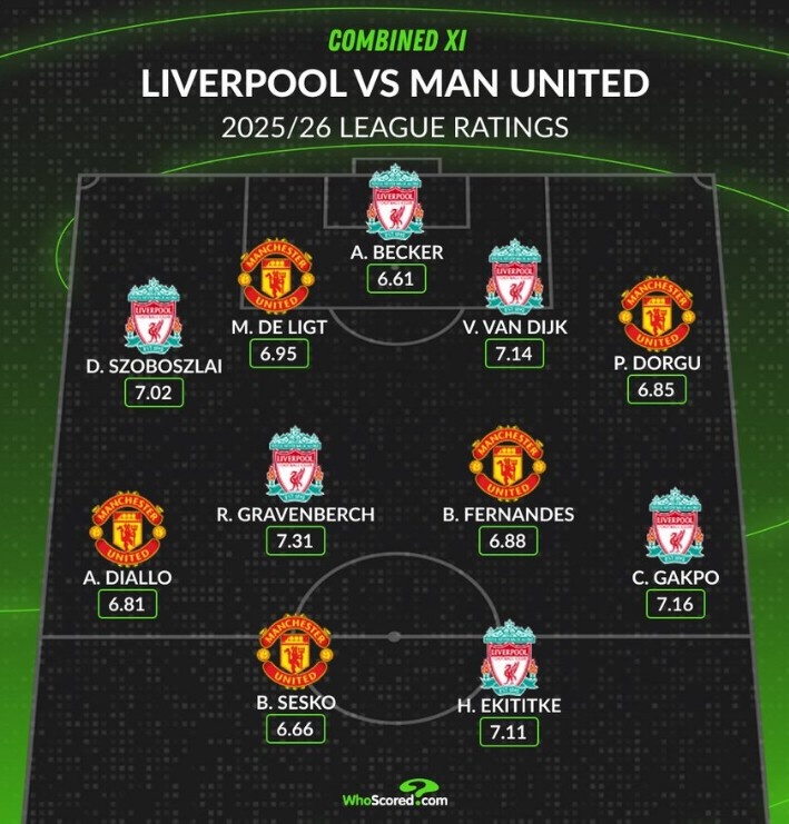 直播吧10月19日讯本轮英超将上演曼联与利物浦的焦点对决,数据网站Whoscored也盘点了两队球员本赛季英超场均评分最高阵容,具体如下: