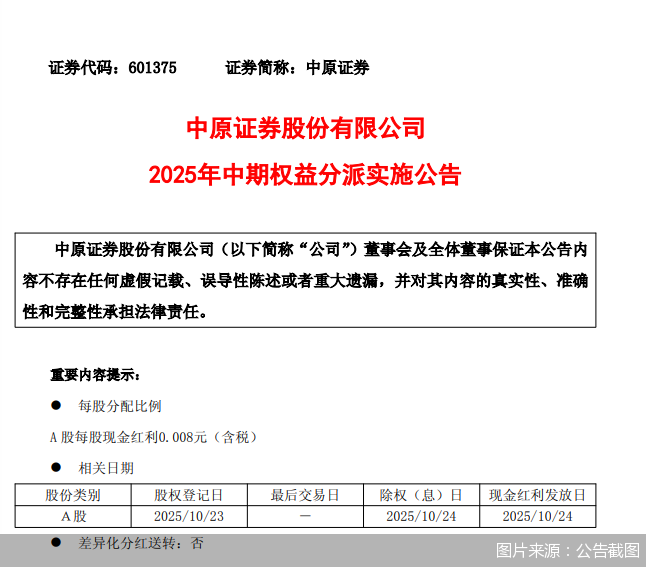 北京商报讯(记者刘宇阳实习记者王琛)10月20日,中原证券发布2025年半年度权益分派实施公告,每股派发现金红利0.008元(含税),共计派发现金红利3714.31万元,现金红利发放日为10月24日。